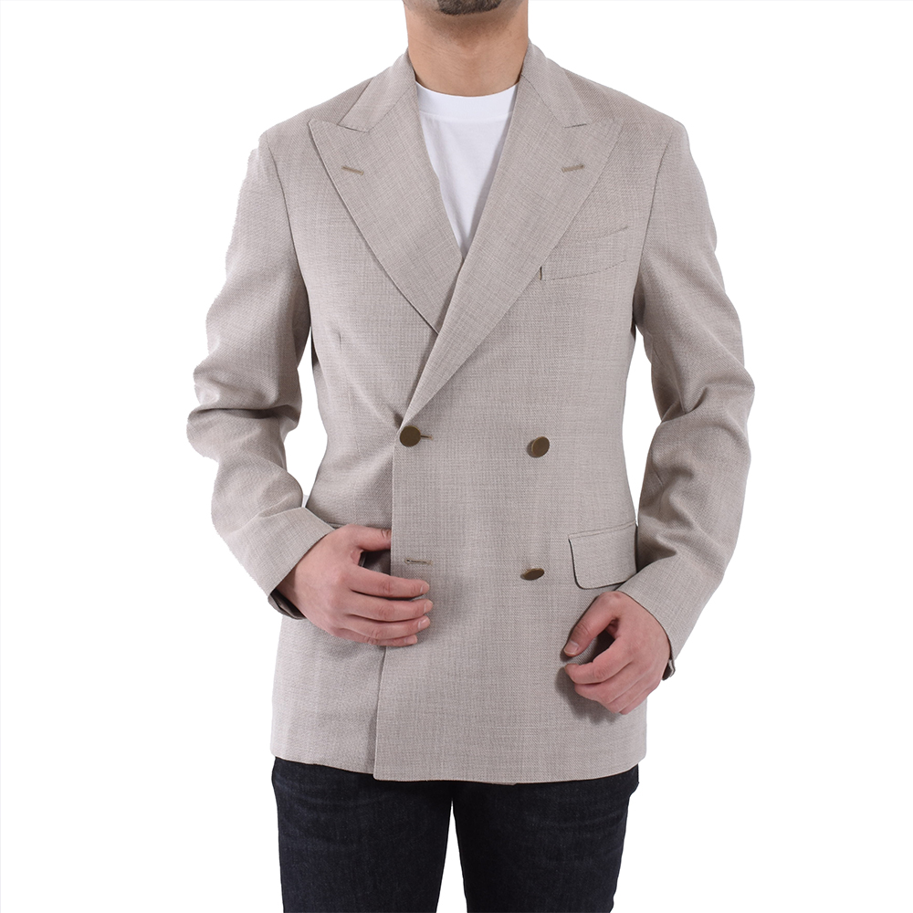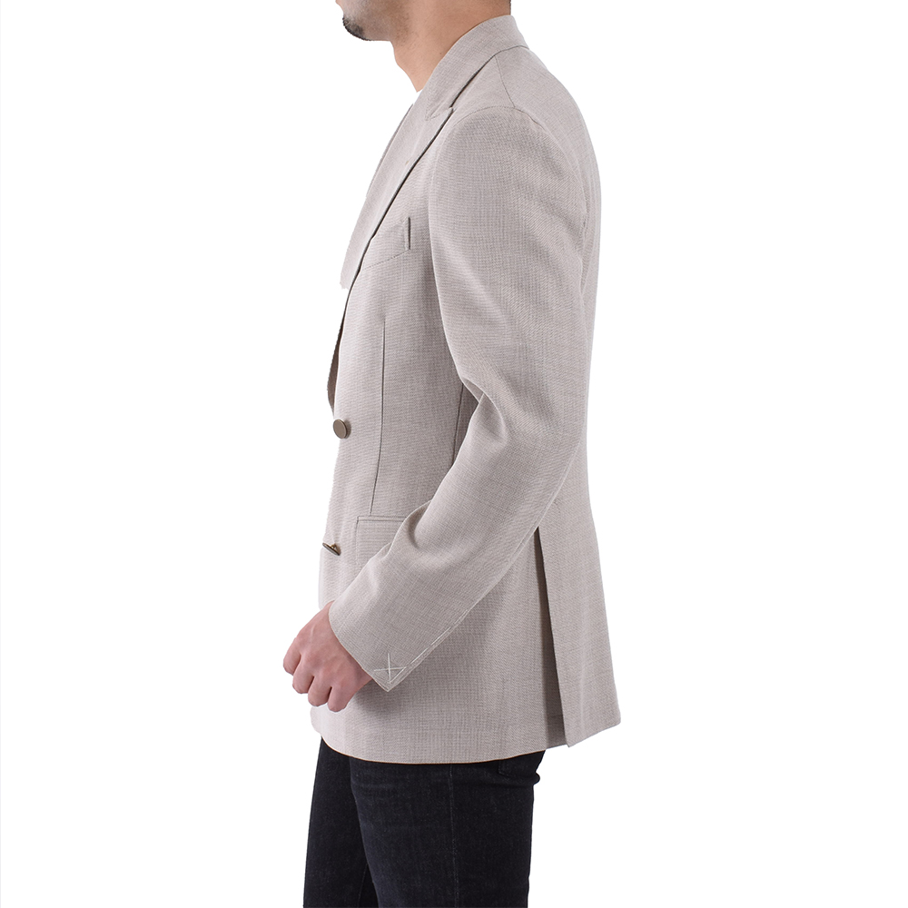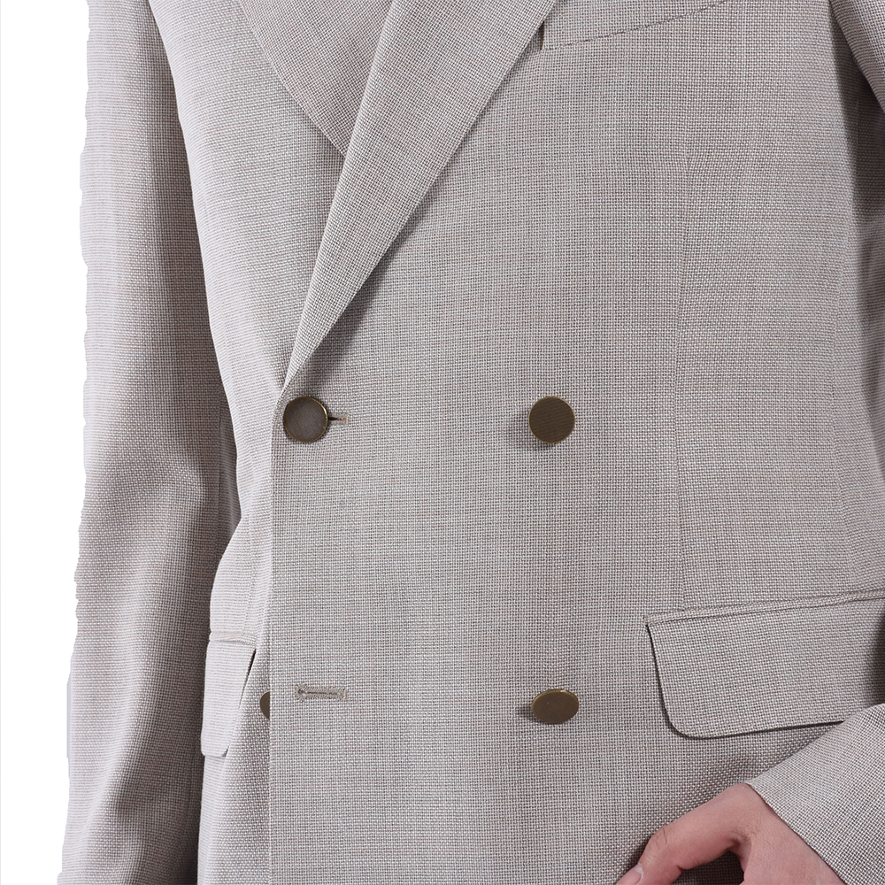 ・こちらは4つボタンの上一つ掛け。きちんと感の強いダブルブレステッドではあるものの、ゴージラインやボタン位置が高くは見えないように設定されているため程よいリラックス感があります。ヘアラインストライプのような模様が入ったアンティークゴールドのメタルボタンがポイントに。