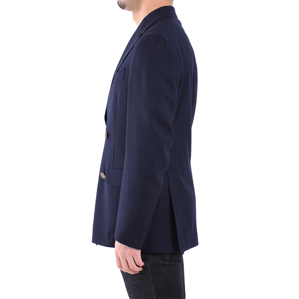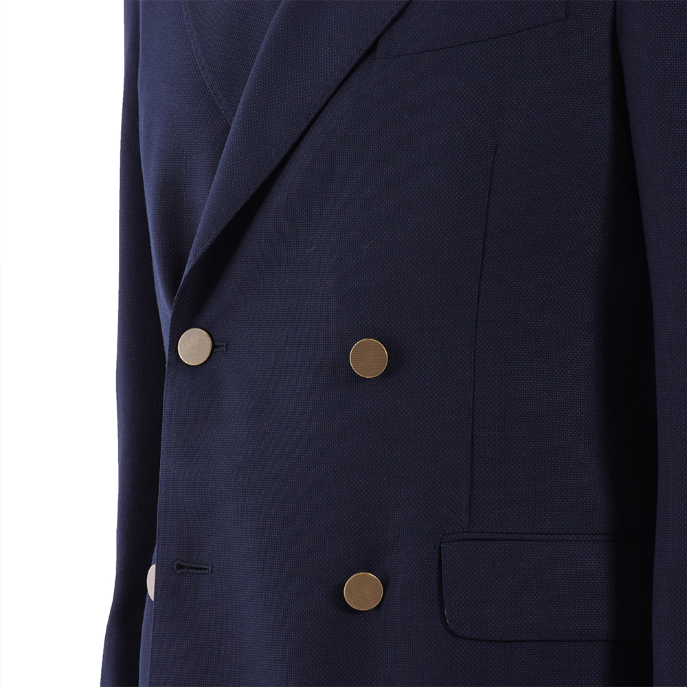 ・こちらは4つボタンの上一つ掛け。きちんと感の強いダブルブレステッドではあるものの、ゴージラインやボタン位置が高くは見えないように設定されているため程よいリラックス感があります。ヘアラインストライプのような模様が入ったアンティークゴールドのメタルボタンがポイントに。