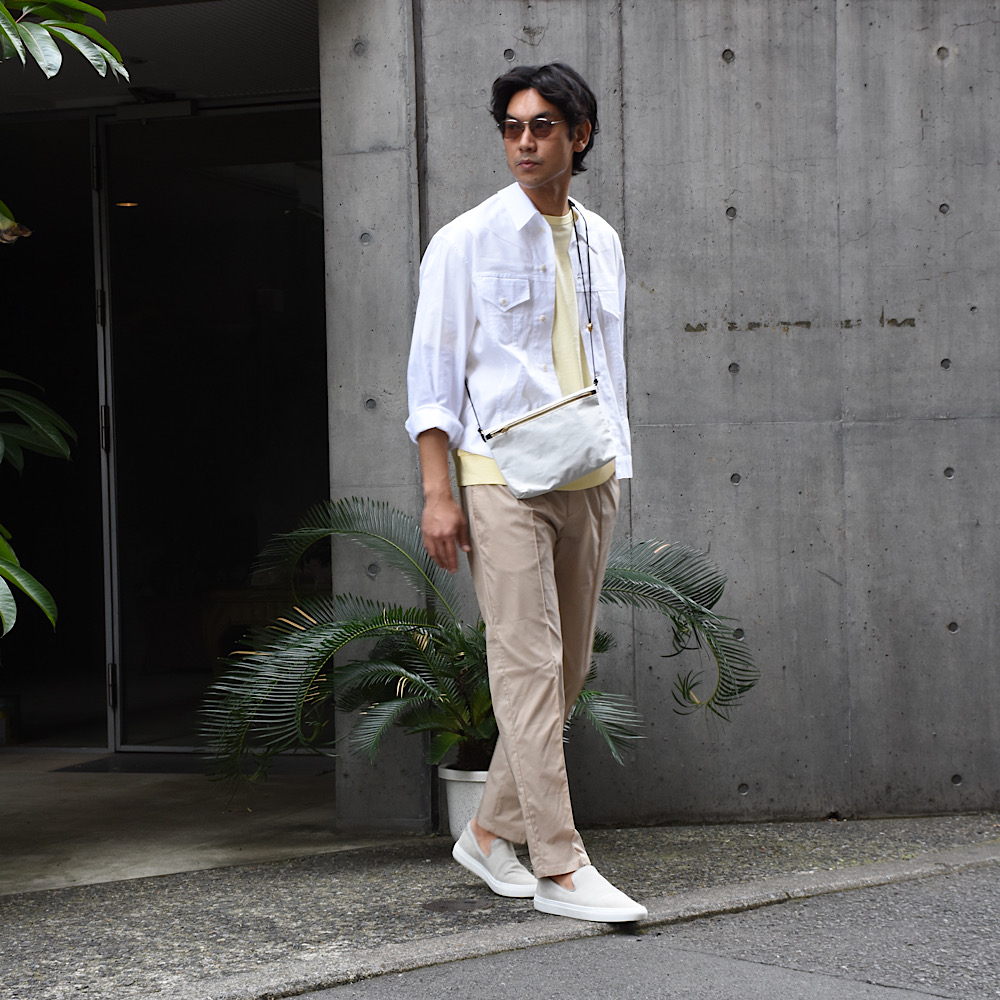 ・生地はシャツ生地のピンポイントオックスフォード。しなやかで微光沢感を備えたクリーンな雰囲気が特徴で、肌離れが良く気温の高い時期でも快適に過ごせます。ホワイト / ブルーの2色、生地違いのシャンブレーをラインナップ。