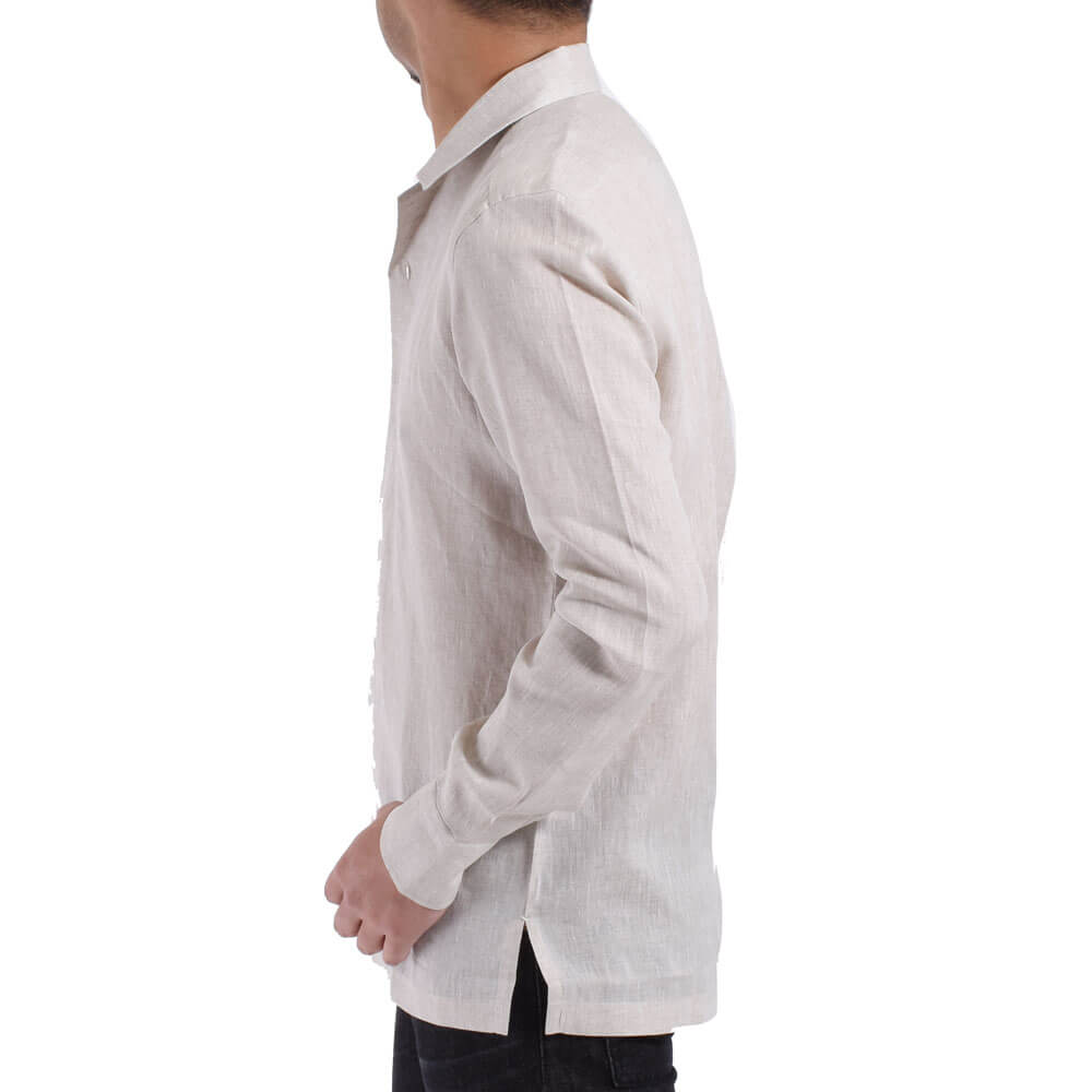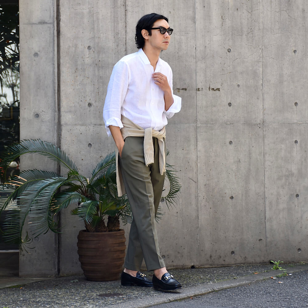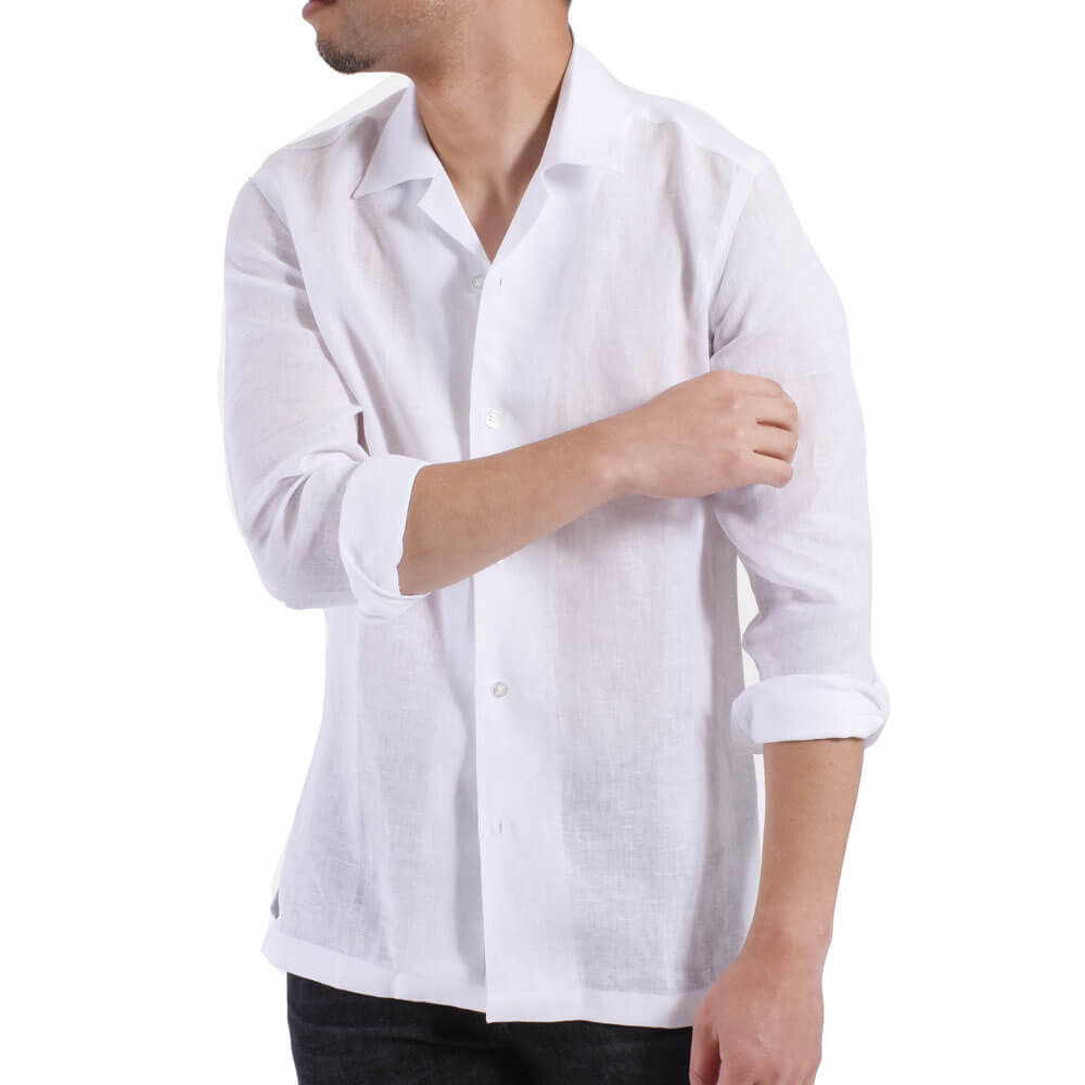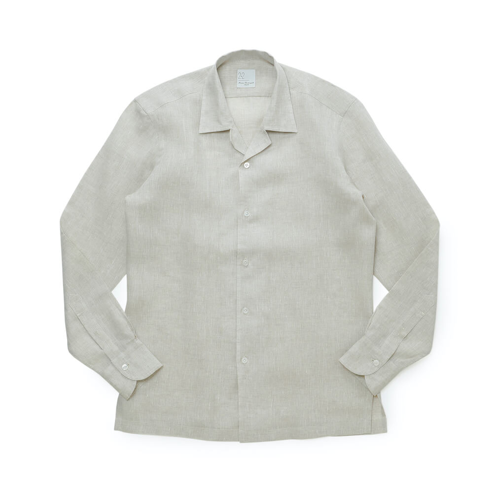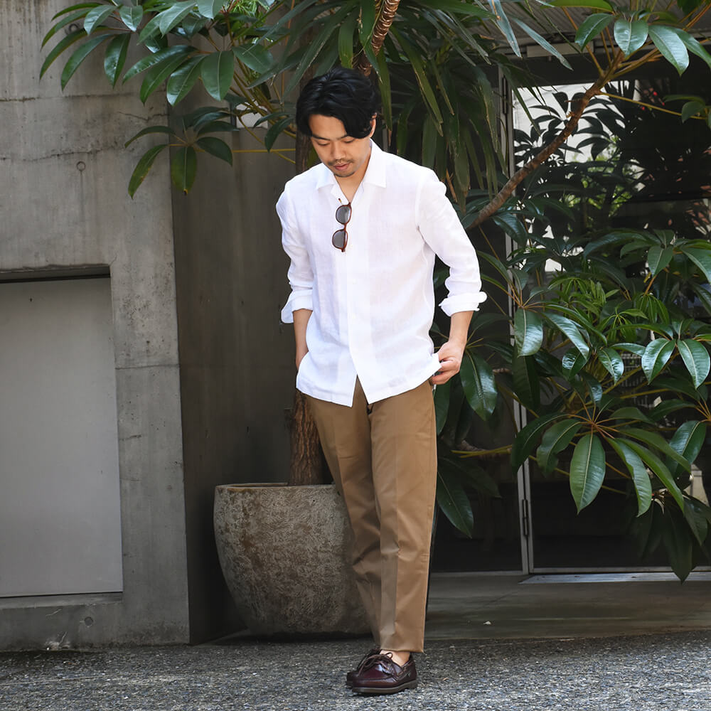 肌あたりの良いリネンを使っていますので、ゴワつきがなく着心地が◎。休日はもちろんのことリモートワーク等でも使い勝手がよく、色違いで何枚も欲しくなるシャツです。イタリアっぽい色気を出すなら素肌に着てよし、敢えてTシャツを挟んで着てもOK。