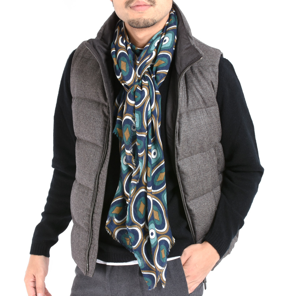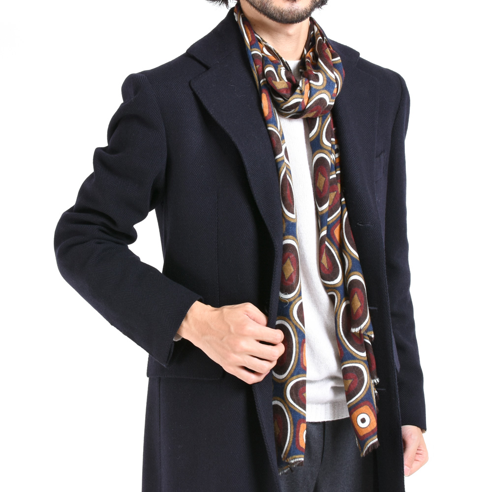 個人的にこういったボリュームの出る巻物や柄物の巻物は、コートを着用した中に垂らして使うなど、さりげなく見えるぐらいの使い方のほうが洒落感で出てオススメです。