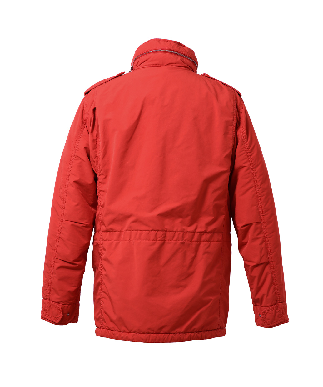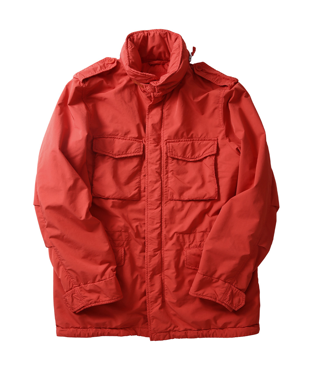 ポリエステルの糸で緊密に織りあげた生地に熱処理を加えて織り目を潰すことで雨や風に強いハイテク素材を使ったジャケット。デザインはミリタリースタイルのM-65のスタイルを踏襲した立ち襟のハーフ丈モデル。ミニフィールドモデルに比べ身幅・着丈共に大きめに設定されています。 フラップ付きの4ポケットデザインは機能的かつ洗練られたデザインで、男臭さい雰囲気を演出するのにピッタリなアイテムとなっています。薄めの中綿が入った固定ライニングが重ね着を可能にしカジュアルスタイルはもちろん、ジャケットスタイルと組み合わせれば定番のミラノスタイルが出来上がります。