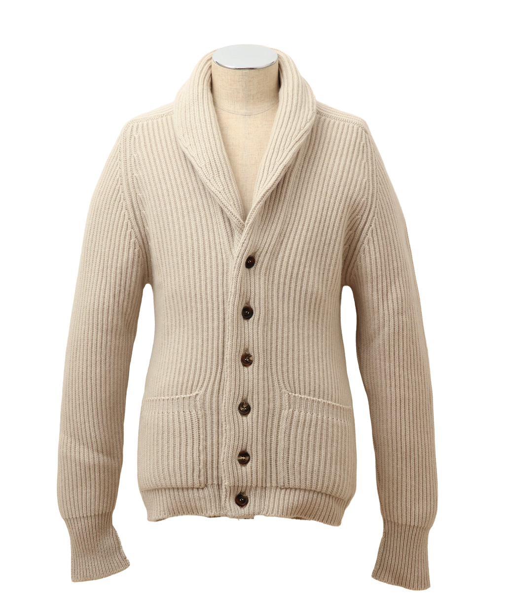 カシミヤのぬくもりとエレガンスが調和する、ショールカラーカーディガンセーター。
