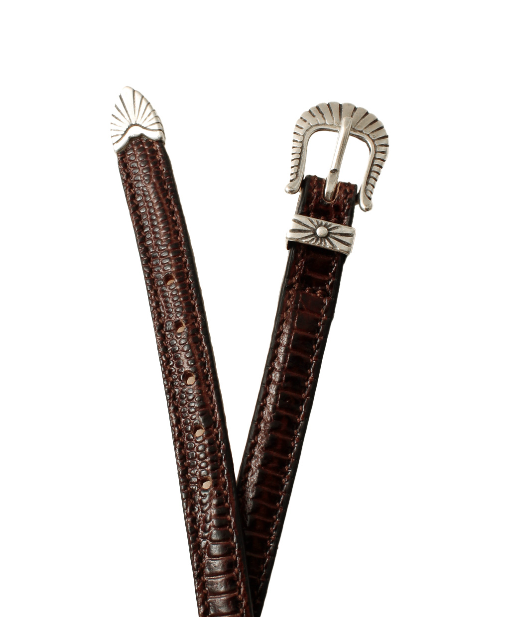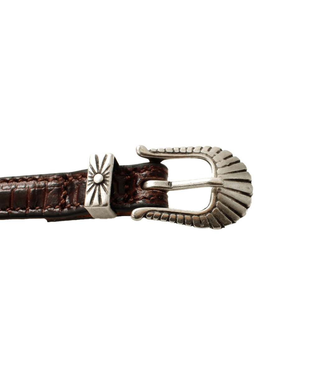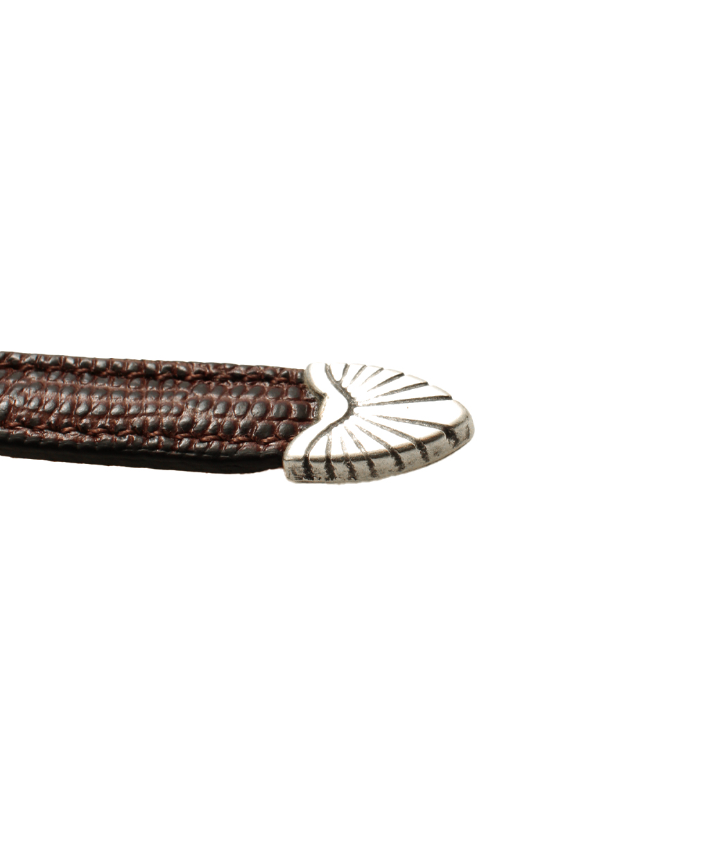 柔らかなシボが美しい高級感あふれるカーフレザーを使用し、人気のウエスタンベルトのデザインをそのまま小ぶりに落とし込んだレザーブレスレット。存在感のあるバックルや剣先のメタルディテールが手元に程よいアクセントを添えます。