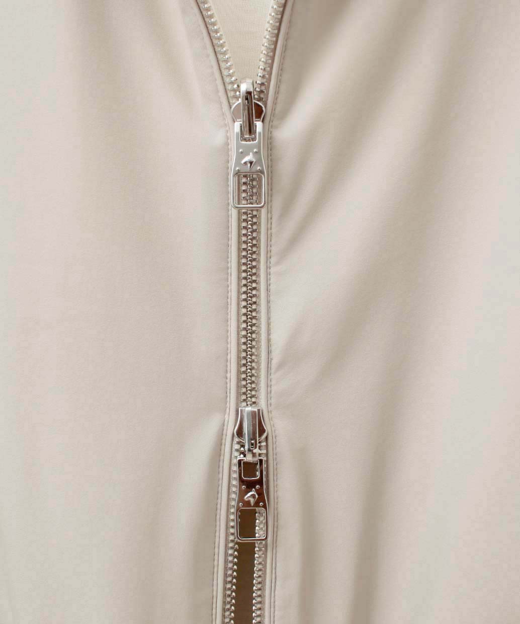 フロントには高級感あふれるダブルジップを配し、開け方次第でシルエットの調整が可能。