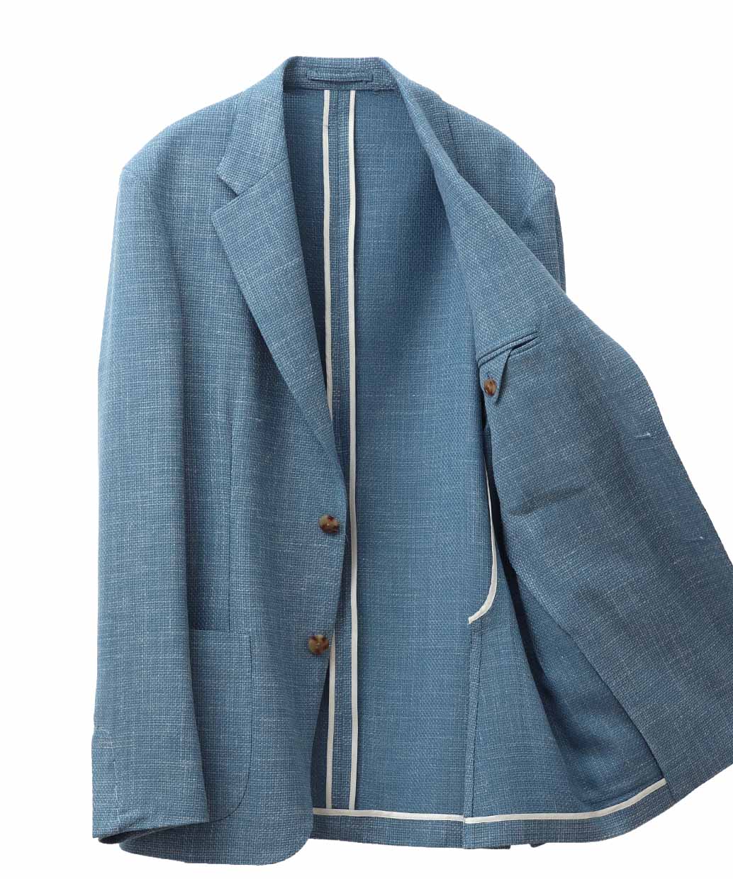 上質なサマーウールをベースに、シルクとリネンをブレンドした糸で織り上げたジャケット。ザックリとした表情が特徴のホップサック織りを採用し、通気性の良いサラリとした質感が春夏シーズンにも快適な着用感をもたらします。リネン由来の自然な風合いとウールの上品さが調和し、ナチュラルさと程よい高級感を兼ね備えた仕上がり。軽快で清涼感のある佇まいが、大人の春夏スタイルを洗練された印象へと導いてくれる一着です。