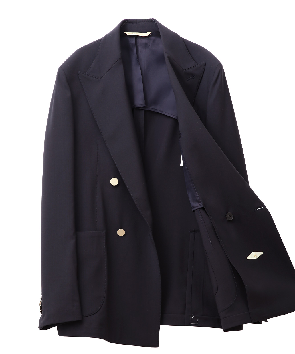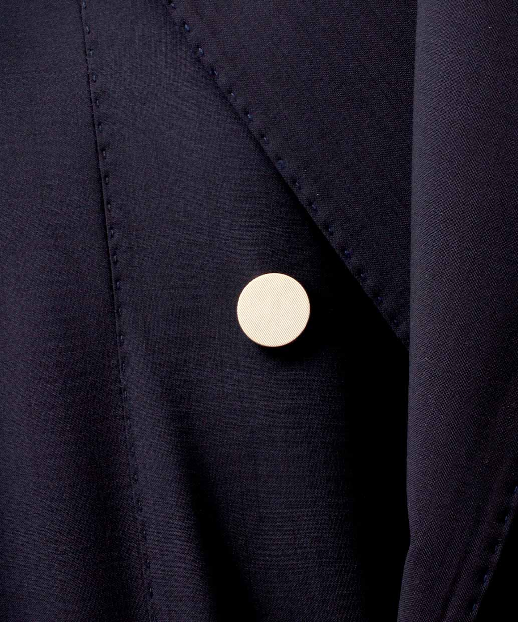・ピークドラペル×ダブル4ボタン(メタルボタン)で、端正さと華やかさを両立
