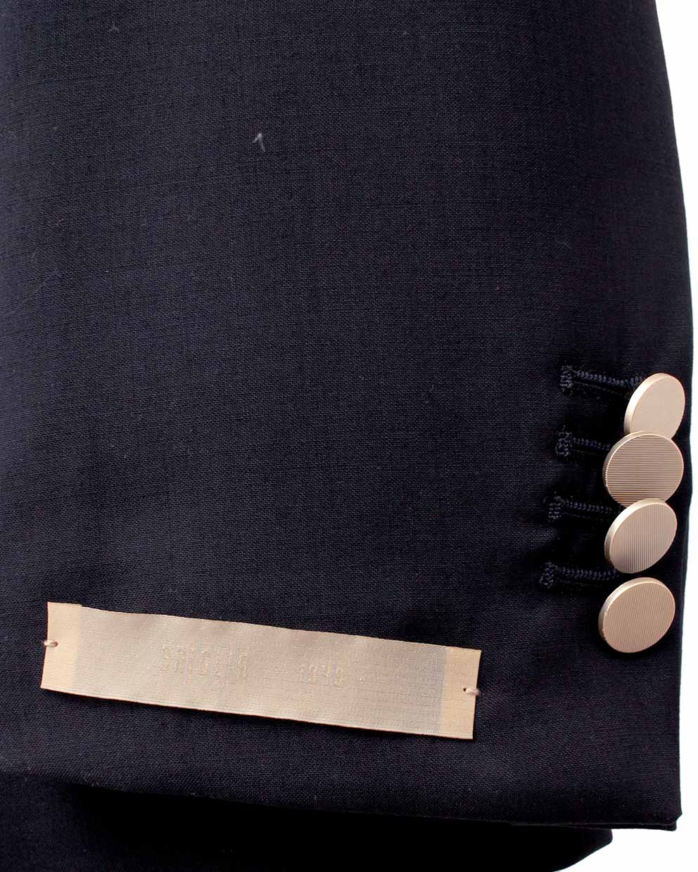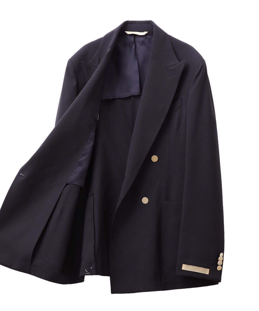 ラペルは凛とした表情を演出するピークドラペルを採用し、ダブルブレストならではの貫禄を上品に昇華。フロントにはメタルボタンを配し、クラシックなムードの中に程よい華やかさを添えています。胸元はバルカポケット、腰はパッチポケットを組み合わせ、ドレス感と軽快さのバランスを調整。背面はサイドベンツ仕様で可動域を確保し、着用時の立ち姿も美しく整えます。