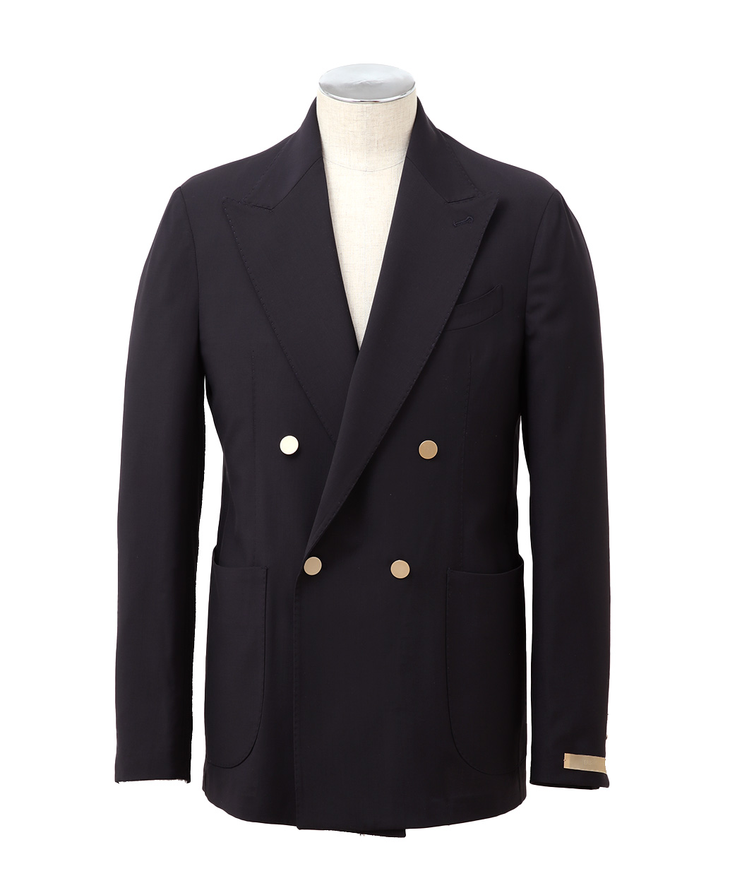 上質なZIGNONE社のトロピカルウールを贅沢に用いた、ダブル4ボタンのピークドラペルジャケット。