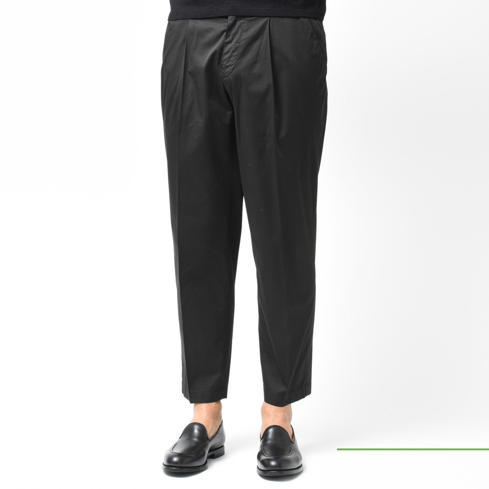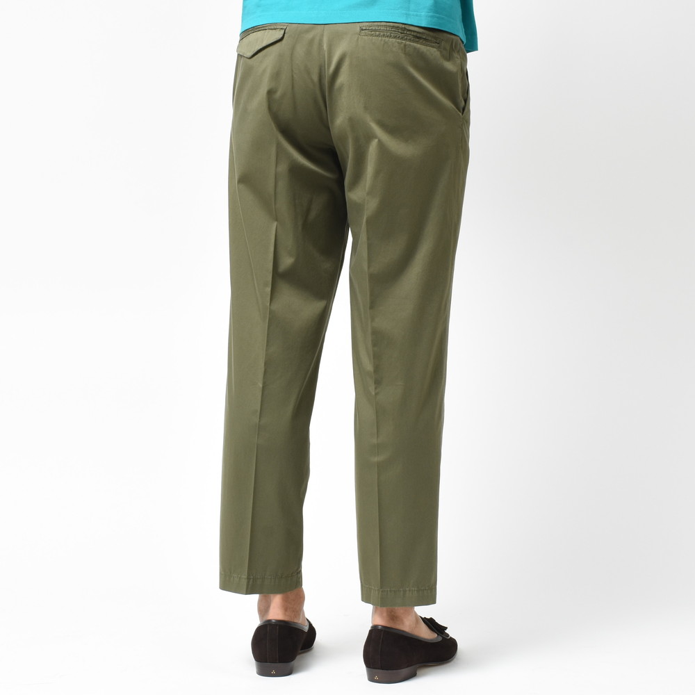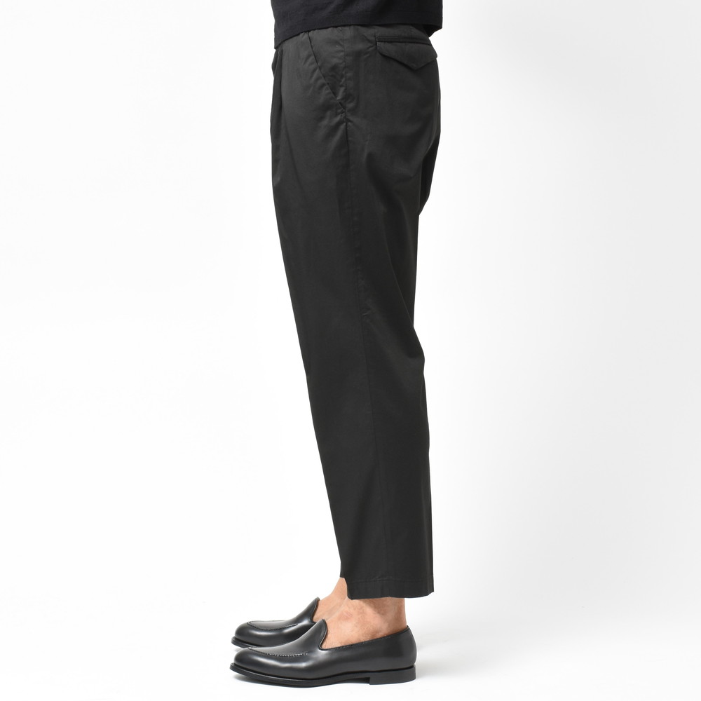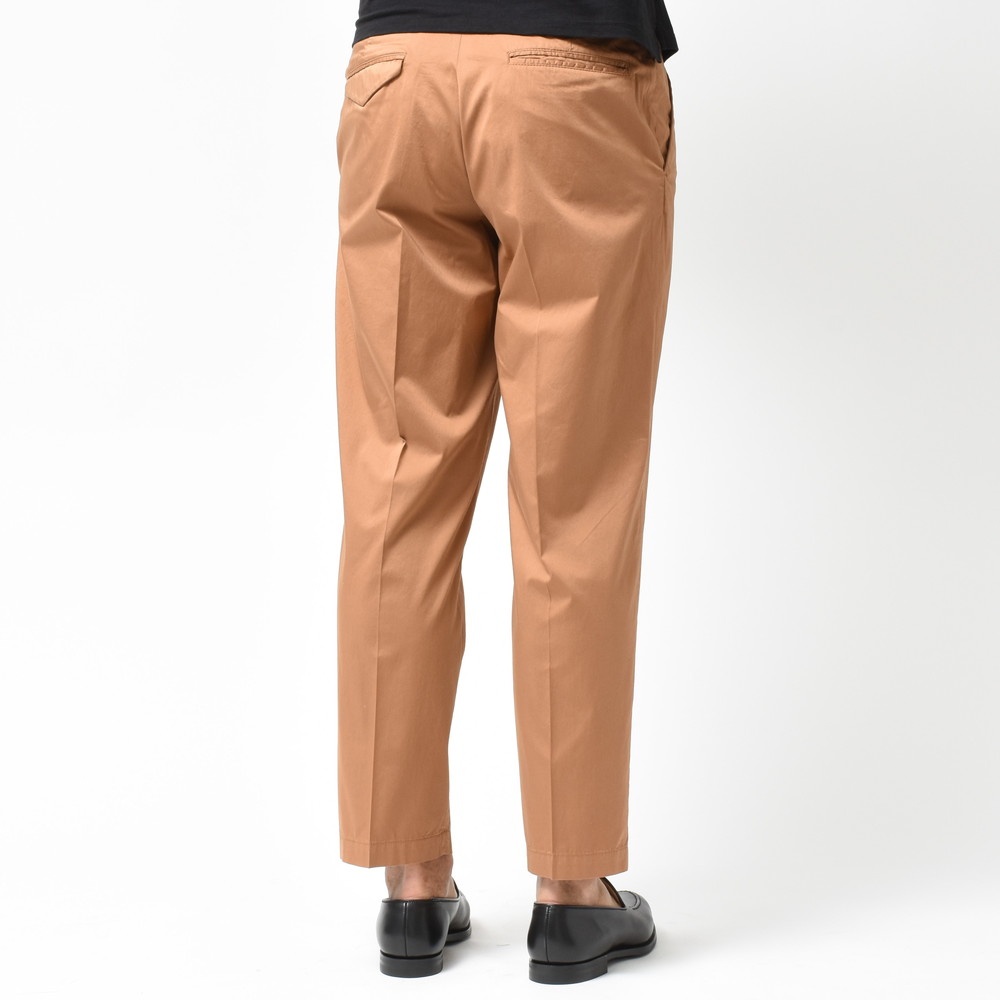適度なリラックスさとデニムやチノなどのカジュアルパンツにはない上品さがあるCellarDoor(セラードアー)のコットンストレッチサテンサイドアジャスター1Pテーパードパンツ、ブランドお馴染みのシルエットに今回はやや光沢感のある生地を採用しておりまして、カジュアルパンツながらもほのかに漂う艶っぽさが素晴らしい存在に仕上がっています。