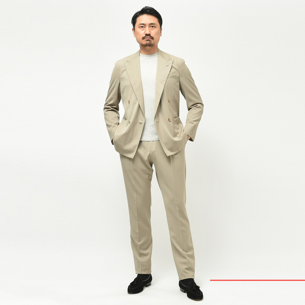 CARUSO(カルーゾ)のファーストセラーモデルBUTTERFLYバタフライダブルジャケットの、最もベーシックなスタイルであるストレッチギャバジンのソリッド生地を用いたモデルです。