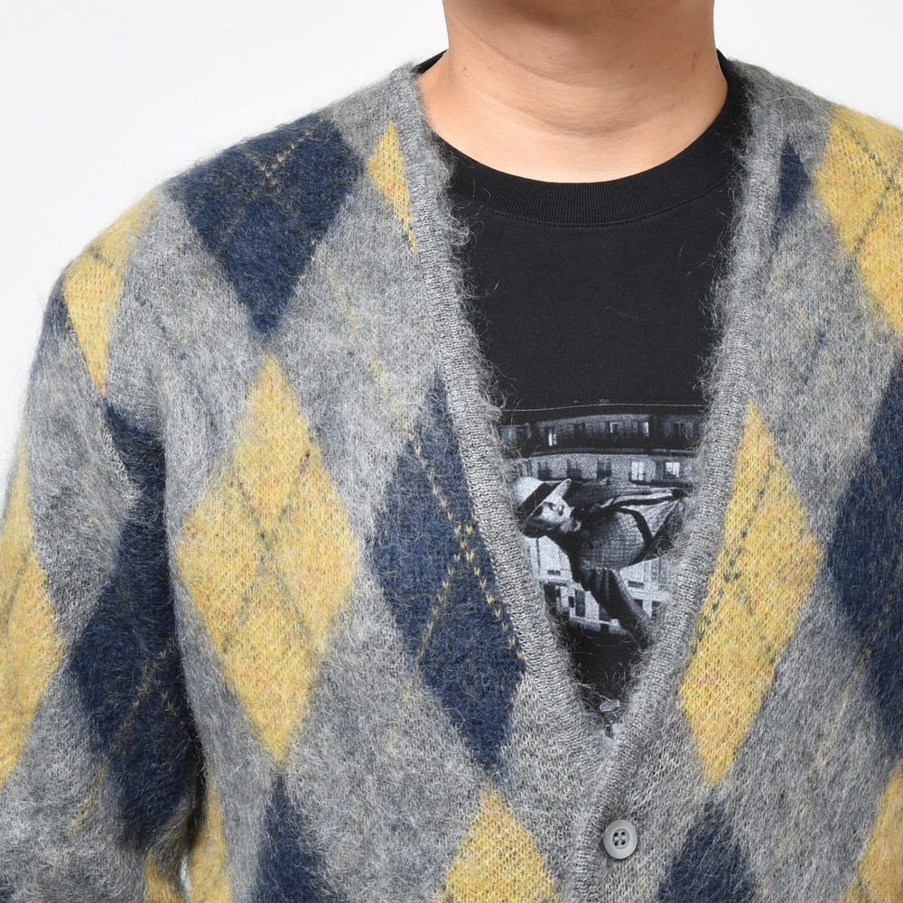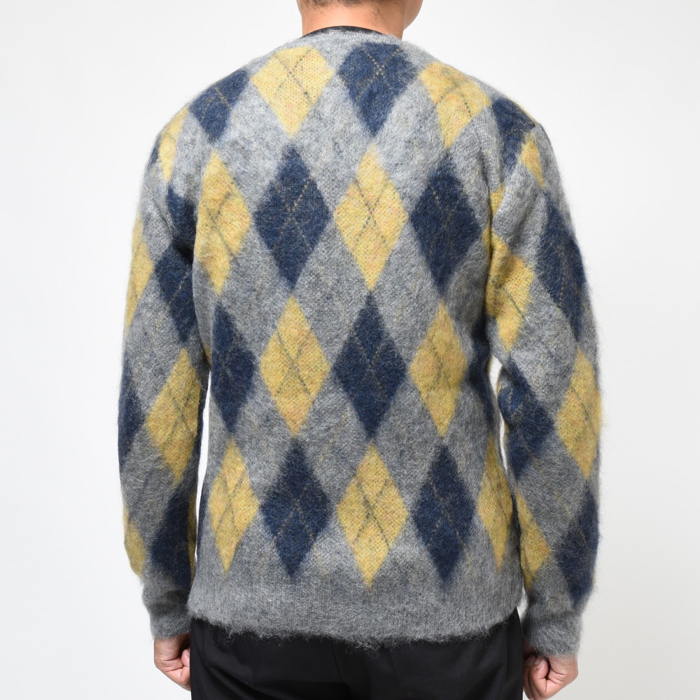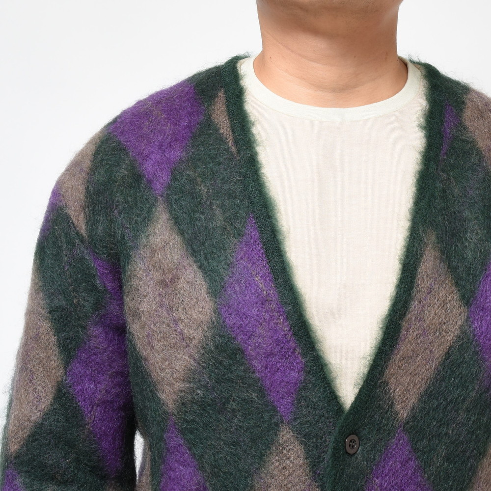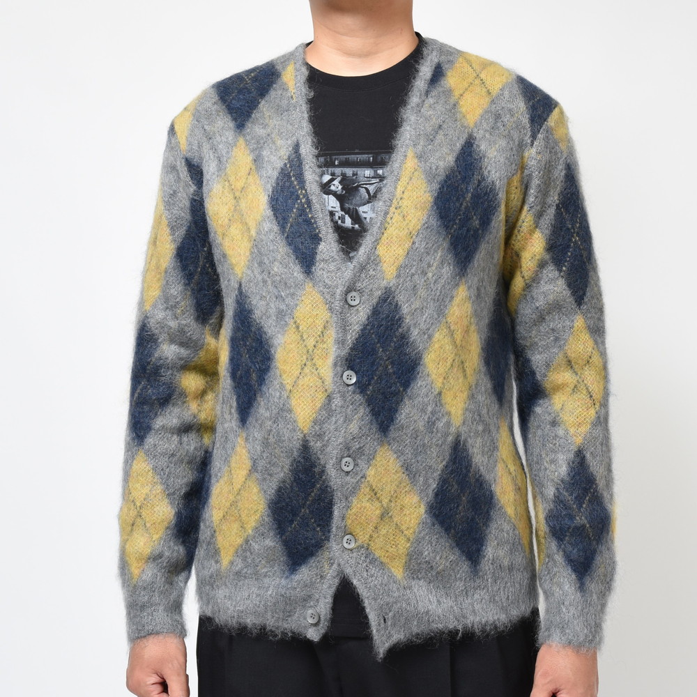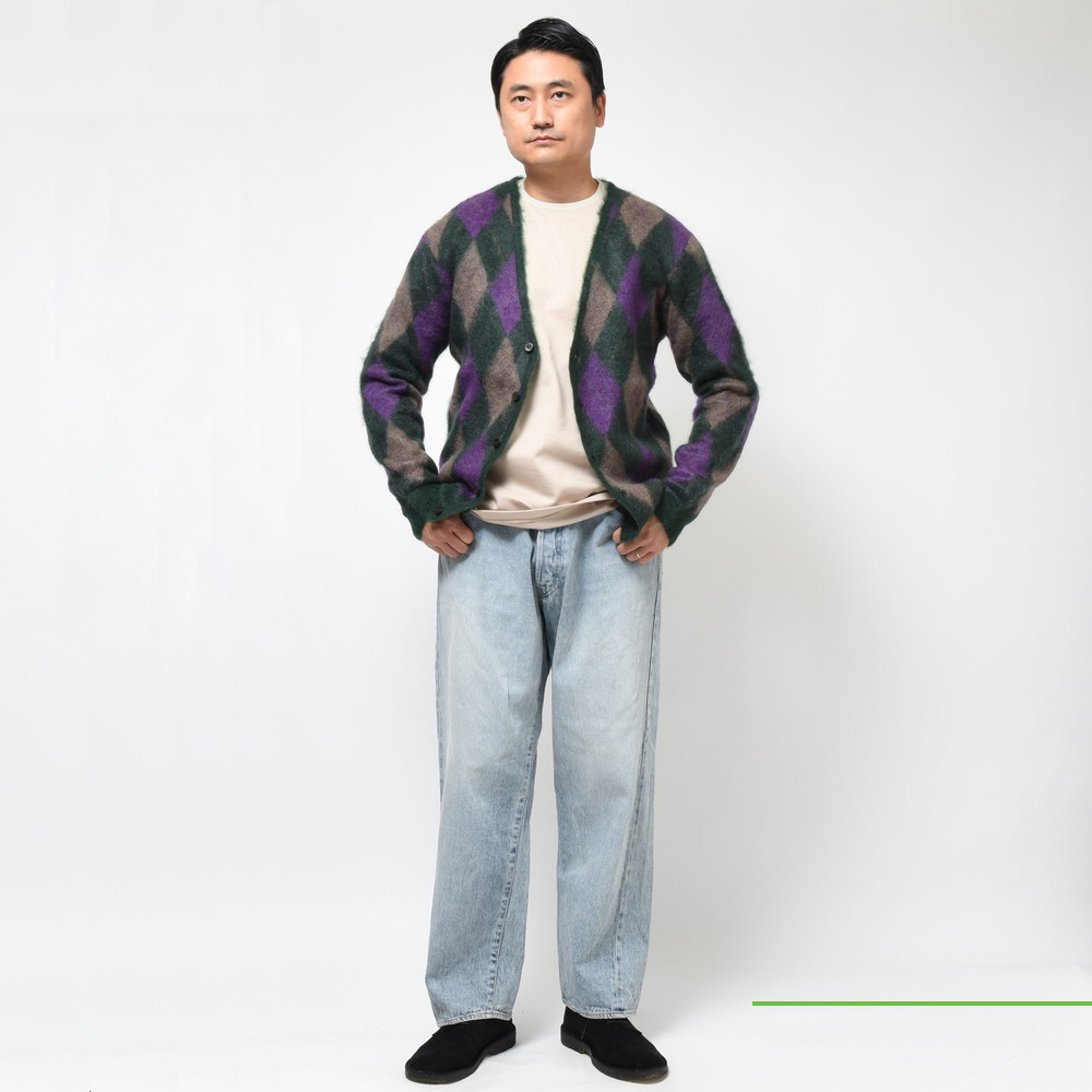 懐かしくも新鮮、それでいて確かにmando(マンド)らしさが漏れ伝わってくるモヘヤナイロンアーガイルニットカーディガン。昨今カジュアルウェア界隈で注目されているモヘヤ混のタイプになっていまして、しっかりと今の気分どころをキャッチしているのもこのブランドならでは。これ一枚でしっかりと勝負できる存在感があります。