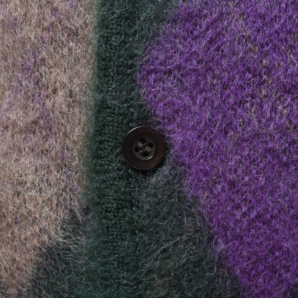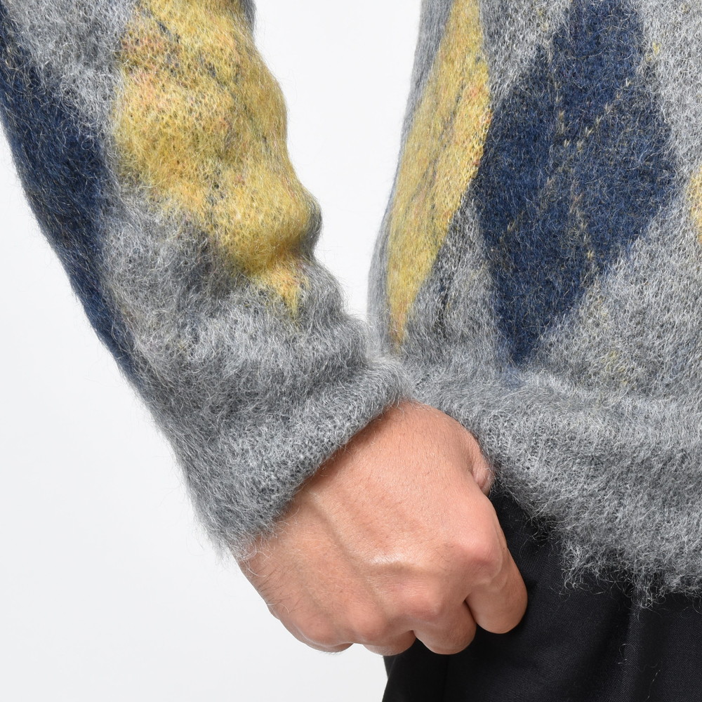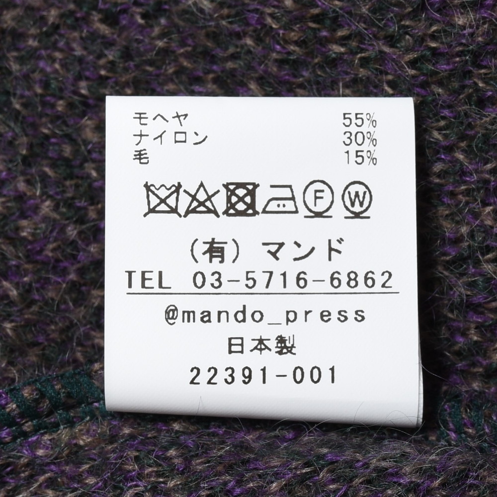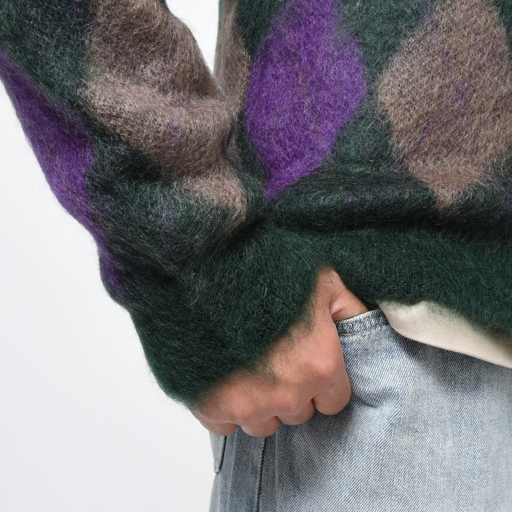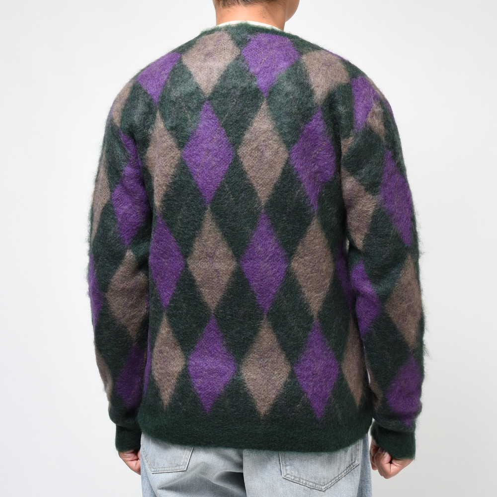懐かしくも新鮮、それでいて確かにmando(マンド)らしさが漏れ伝わってくるモヘヤナイロンアーガイルニットカーディガン。昨今カジュアルウェア界隈で注目されているモヘヤ混のタイプになっていまして、しっかりと今の気分どころをキャッチしているのもこのブランドならでは。これ一枚でしっかりと勝負できる存在感があります。