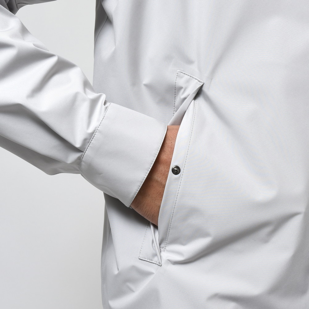 ハリントンジャケットといえば代名詞は“G9”タイプであり、ドッグイヤーカラーが特徴的なディティールになりますが、こちらはベーシックな台襟付きレギュラーカラーであり、よりベーシックでミニマルな見え方に。その分、左腕にはユーティリティポケットをセット、裾をボックスではなく後ろ下がりのラウンド仕様にしているところがポイントです。