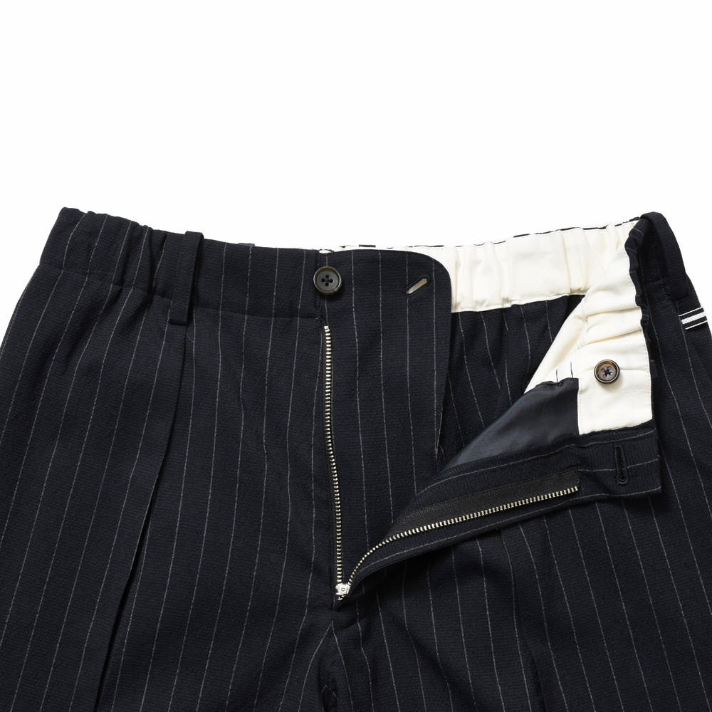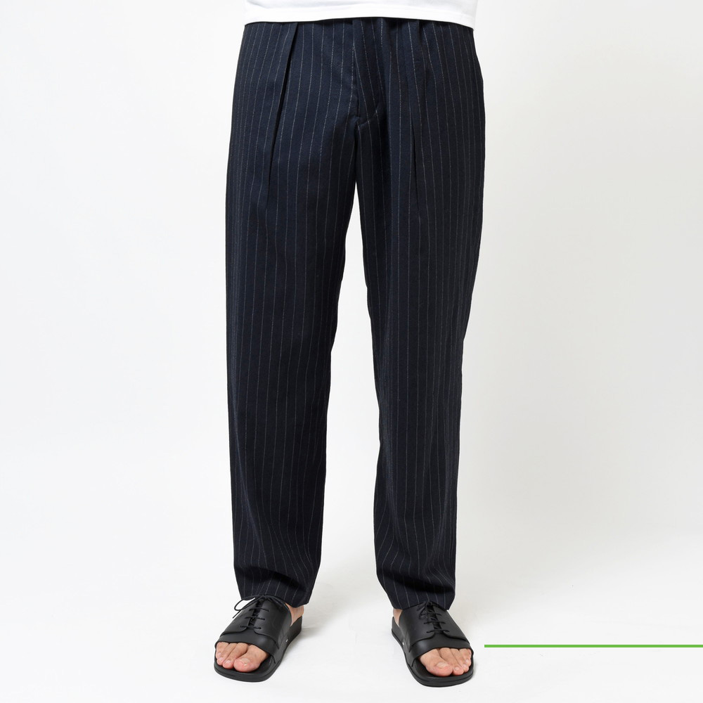 過度にテーパードさせること無くナチュラルに穿けるようなバランスになっていますのでストレスなくクリーンにスタイルが決まってくれる一本、かなり有用性が高めです。またインプリーツ仕様というのも気が効いていまして、タックインして着用した時などもこなれ感を出すことができるんです。遊び心とエレガンス性が両立した一本は中々素敵なものになっています。