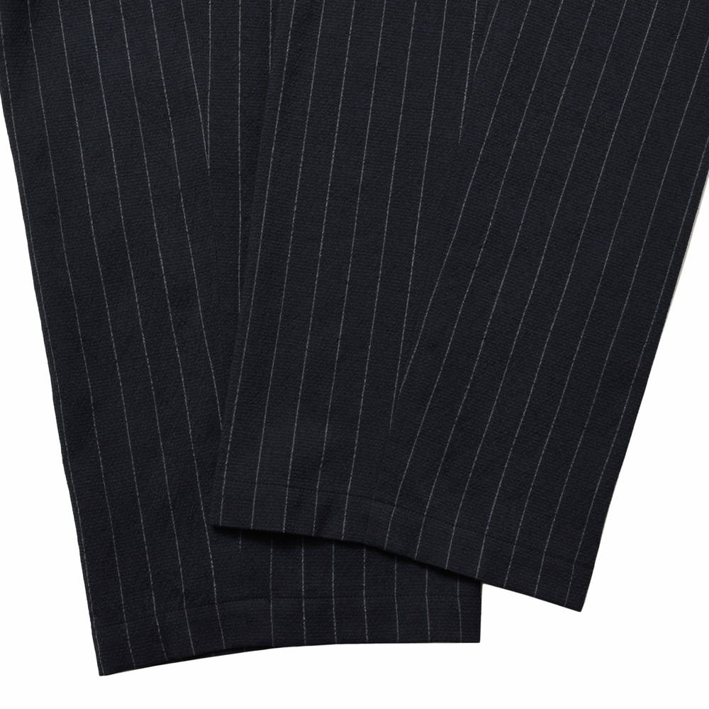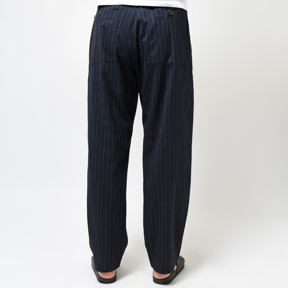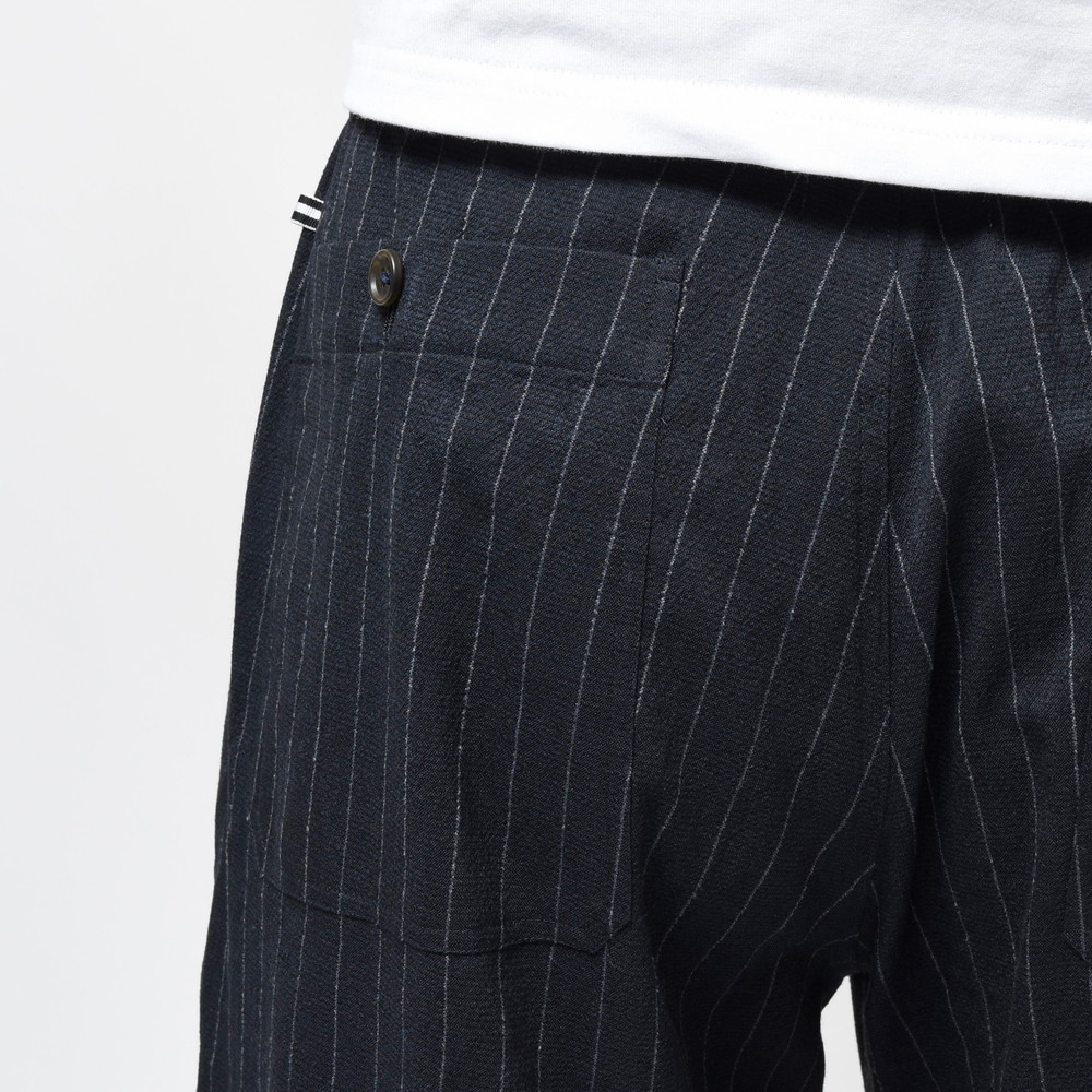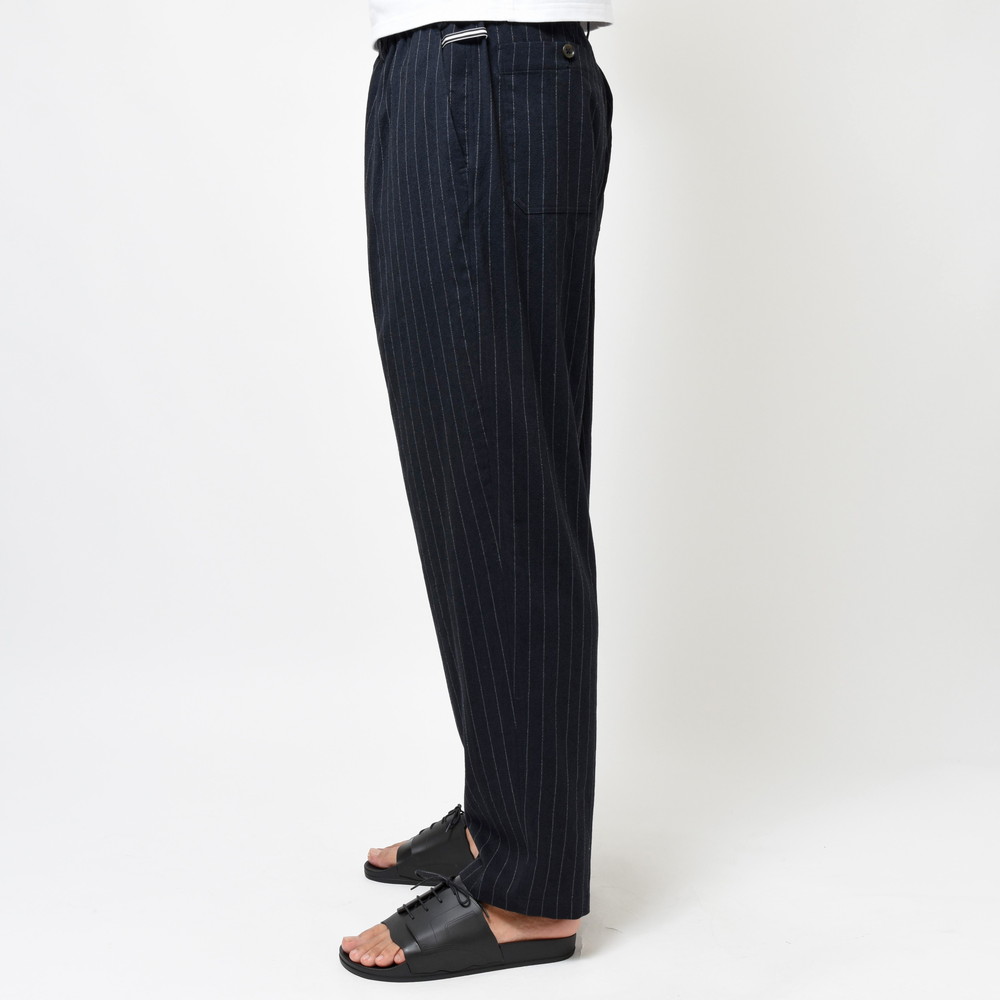 AMBELL(アンベル)の定番的なシルエットであるテーパードパンツ、ウエストシャーリング仕様の一本ではありますがピンストライプを乗せる事によって上手くドレス感とカジュアル感をミックスしたモダンなムードに仕上げています。