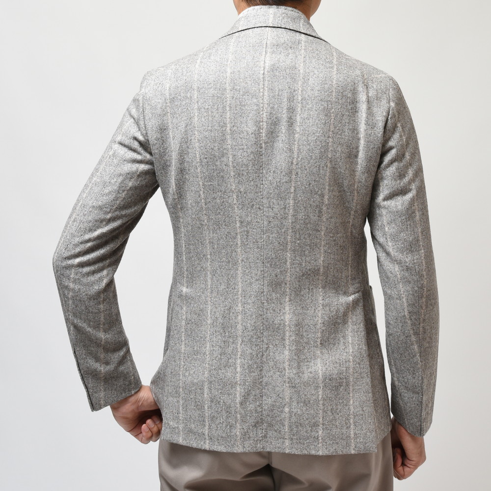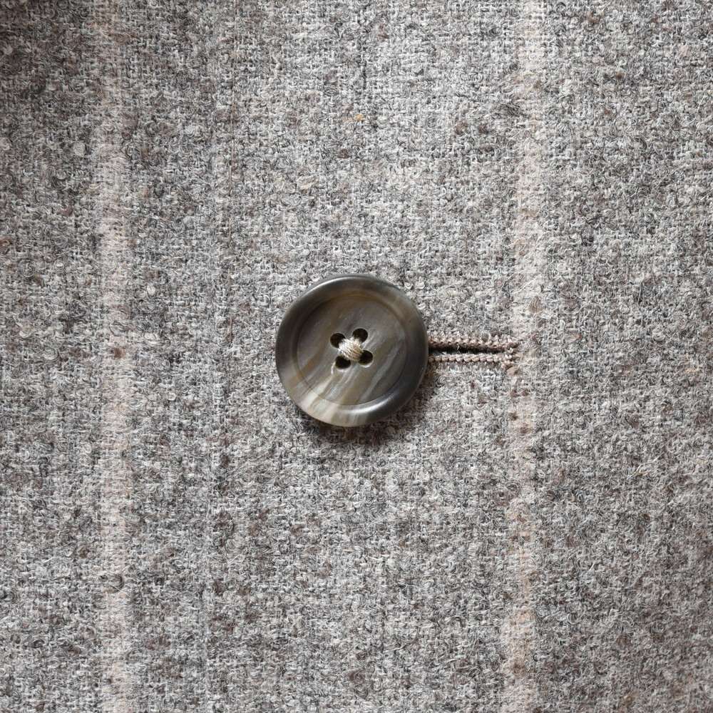 ブークレファブリックはファンシーでフェミニンな見え方になりやすい特性がありますが、渋みと色気溢れる配色にこだわり、ワイドピッチなチョークストライプにすることで男性的なムードをプラス。英国調のニュアンスも相まって、渋味ほとばしる仕上がりになっています。