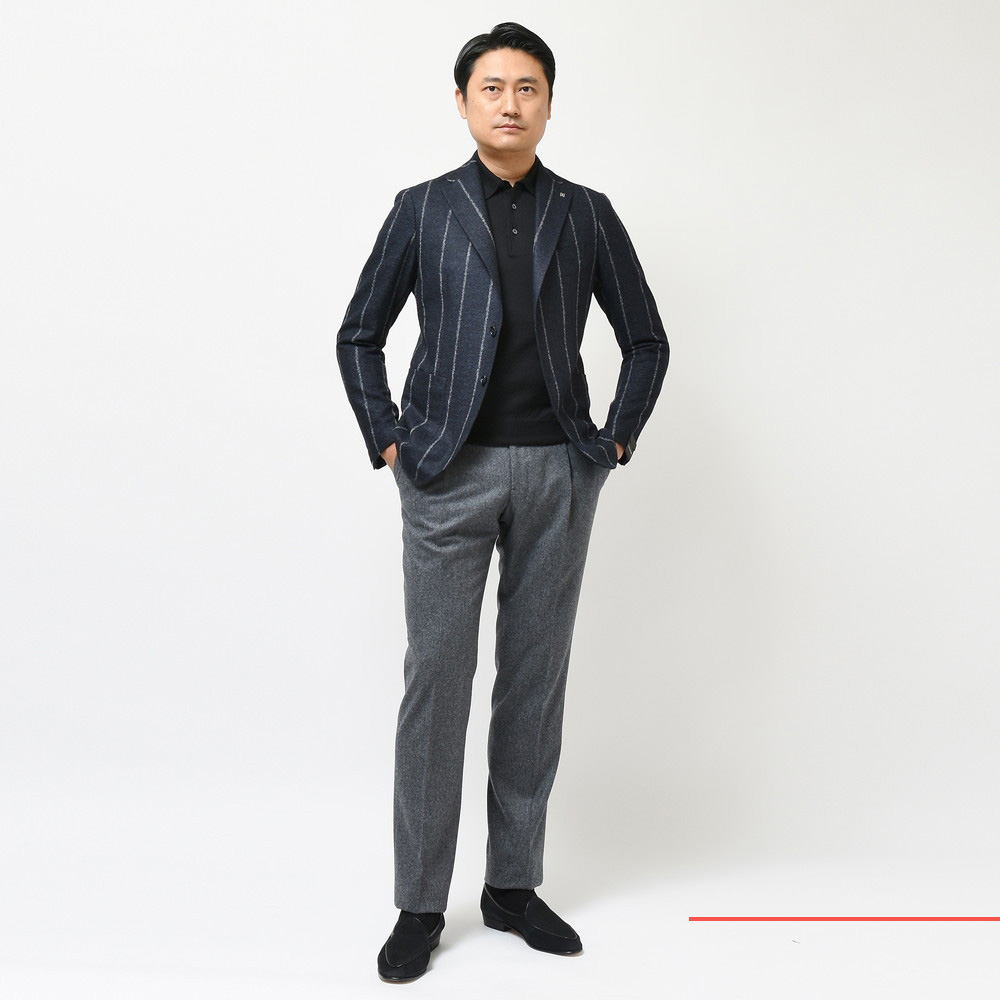 広く取られたライン幅とチョークストライプが相まって締まりすぎず、緩さのあるカジュアルな印象が見受けられます。