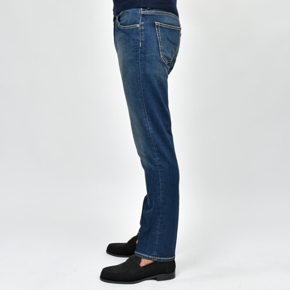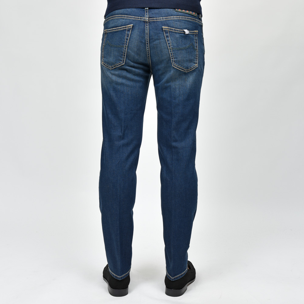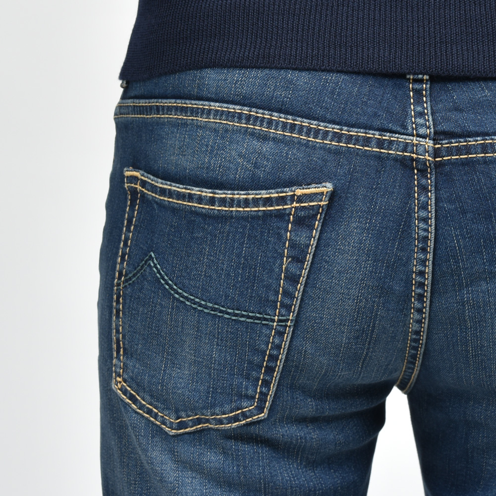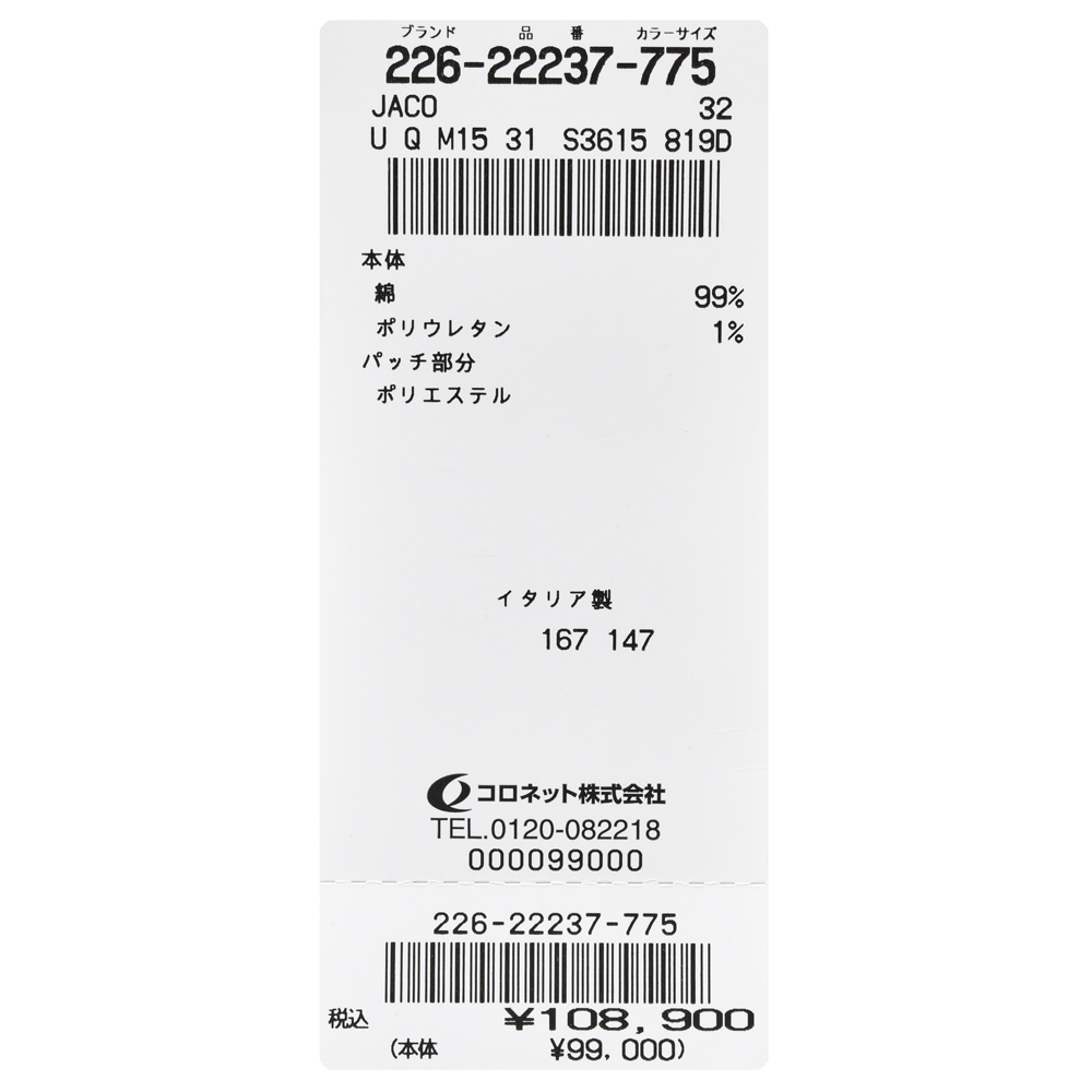 革パッチやボタン・部分的な刺繍のカラーを統一してまとめるのはJACOB COHENお馴染みの手法ですが、こちらはインディゴと相性の良い深いグリーン系となっておりシックな印象を与えます。