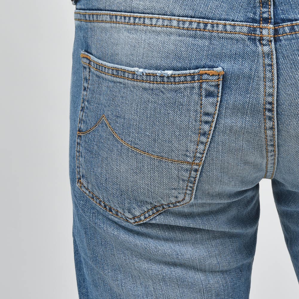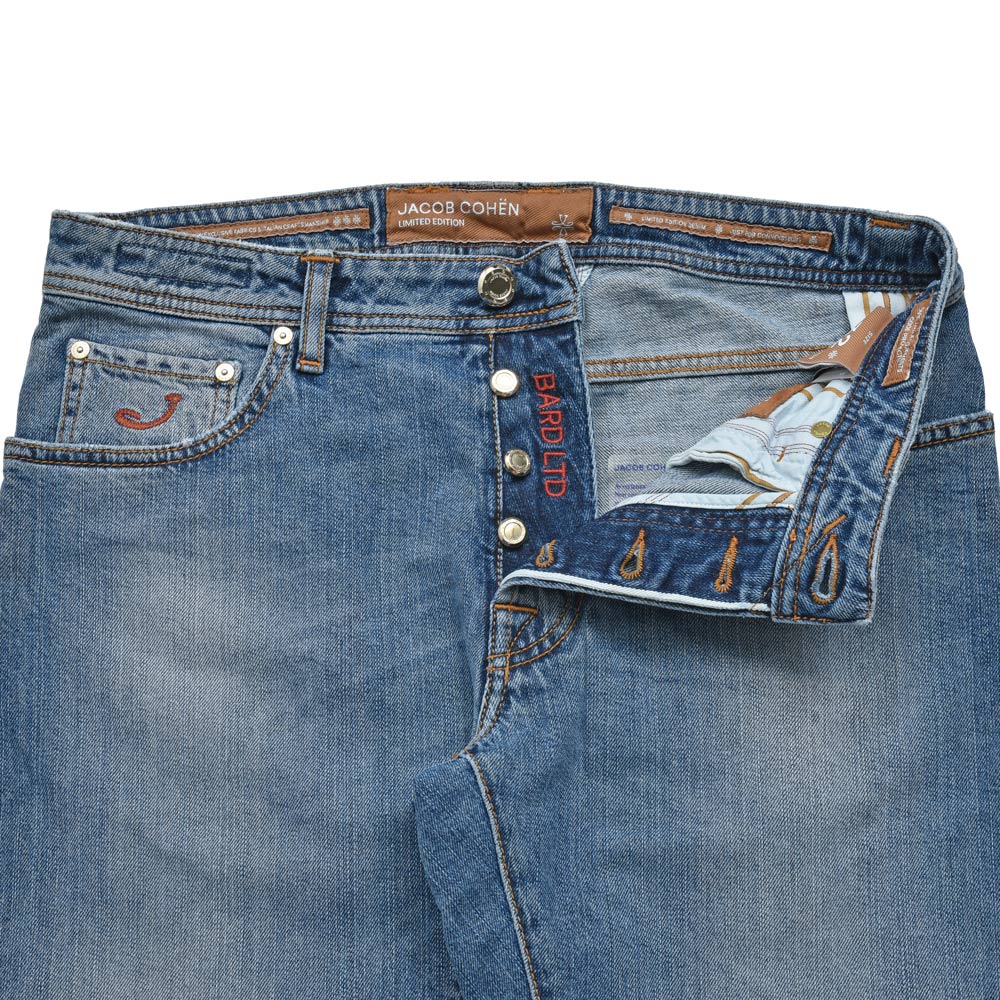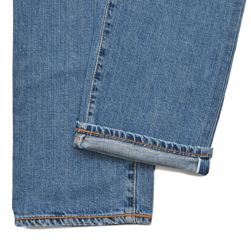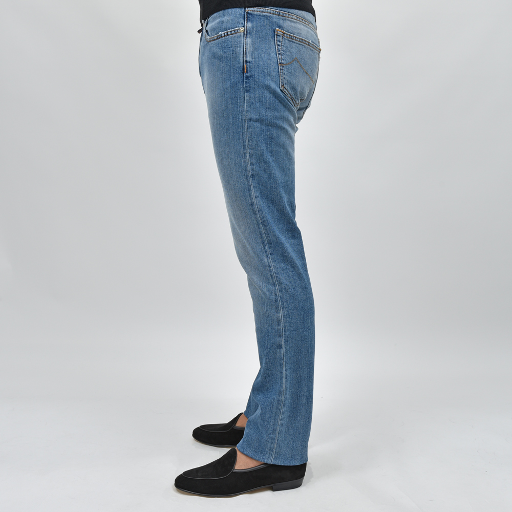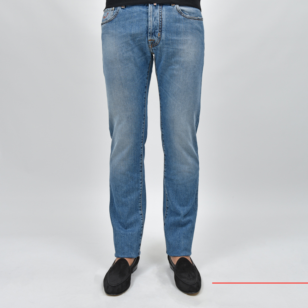 全体にまるで長年に渡って着古したかのような、コントラストをつけすぎない自然なウォッシュを施した一本。膝上辺りのフェード感も抜群に良く、ヴィンテージのような雰囲気がほんのり漂っています。しかしそれで満足しないのがJACOB COHEN(ヤコブコーエン)の魅力です。特に人気の高いモデルであるBARDは足をすっきりと見せてくれるテーパードが効いたスリムシルエットを採用していますので、この雰囲気でありながらイタリアらしい美意識をしっかり備えた、イタリアファッション好きとデニム好きのどちらの方でも納得できるであろう高い完成度を誇ります。