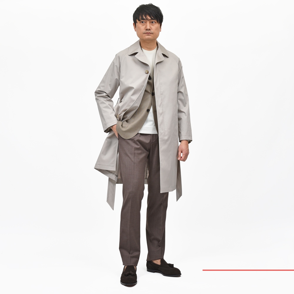 春にミドルウェイト系のコートを羽織ると仰々しく見えてしまうことがありますが、こちらの様に風を感じ、生地が動くタイプのものは足取りを軽やかにし、軽快感を自然に表現することが可能です。