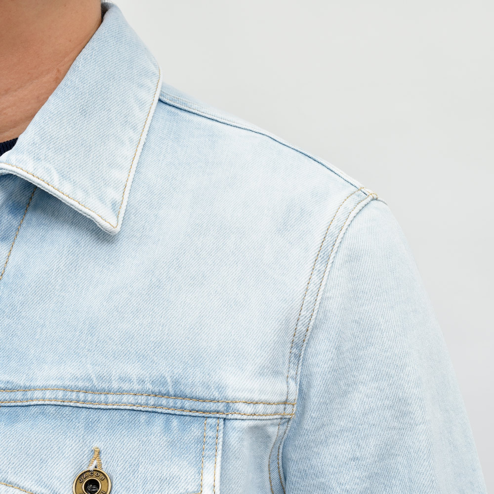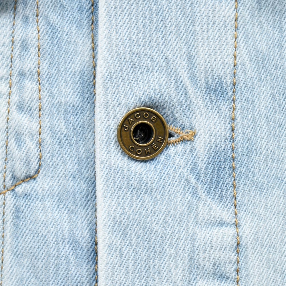 こちらは毎シーズンリリースされているトラッカージャケットよりもややワークなムードを感じさせる仕上がりでして、特徴的なウォッシュの具合もありますが今回はリベットボタンの仕様が定番の形からヴィンテージモチーフのものに変更されているのもポイント。ボタン変更自体は同ブランドのジーンズでも見かけますが、ジャケットではあまり見ない仕様です。こういったさり気ない変化で与える印象を変化させる手法は細かいディテールまでこだわるJACOB COHENの真骨頂ではないでしょうか。