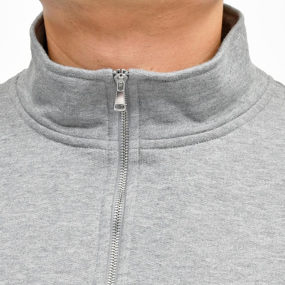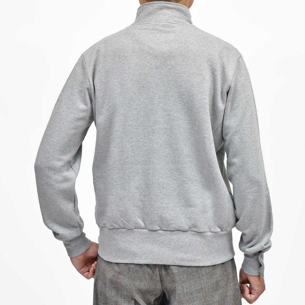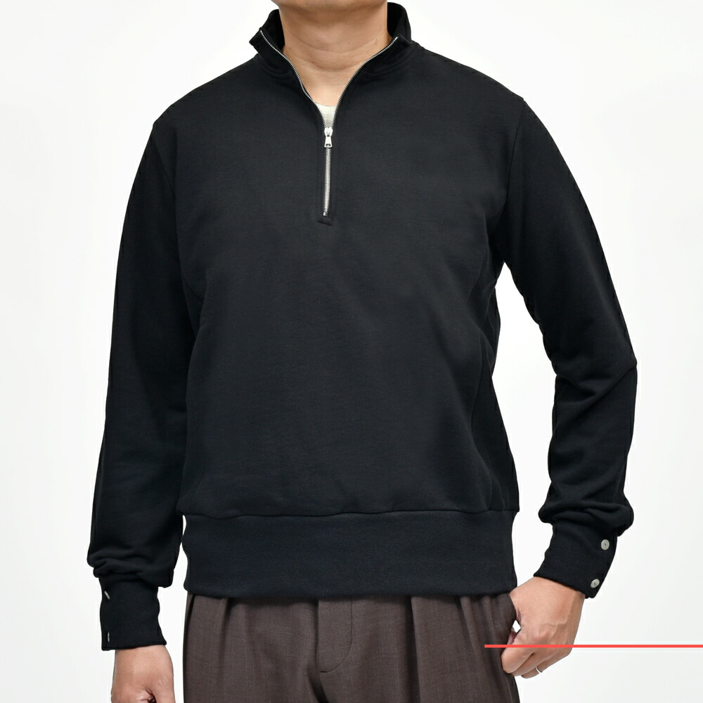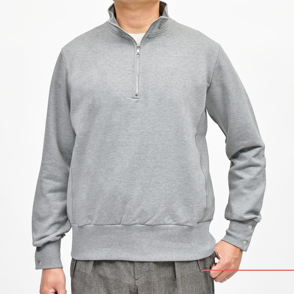 ハイネックタイプのハーフジップで真夏以外着られる裏毛タイプのコットン100%スウェット生地。