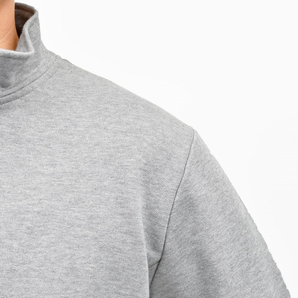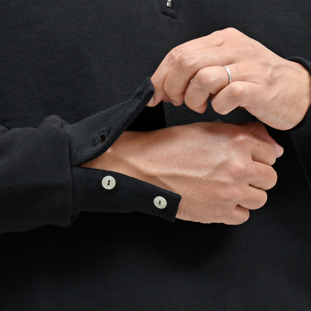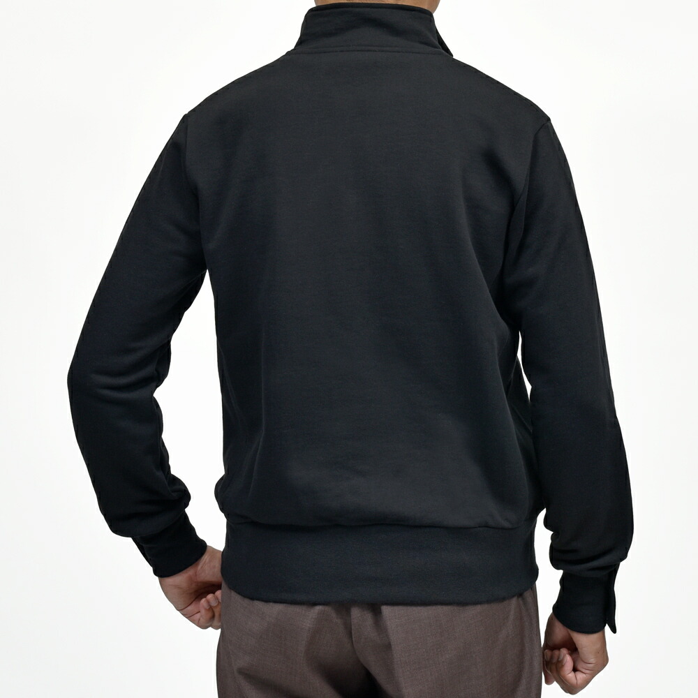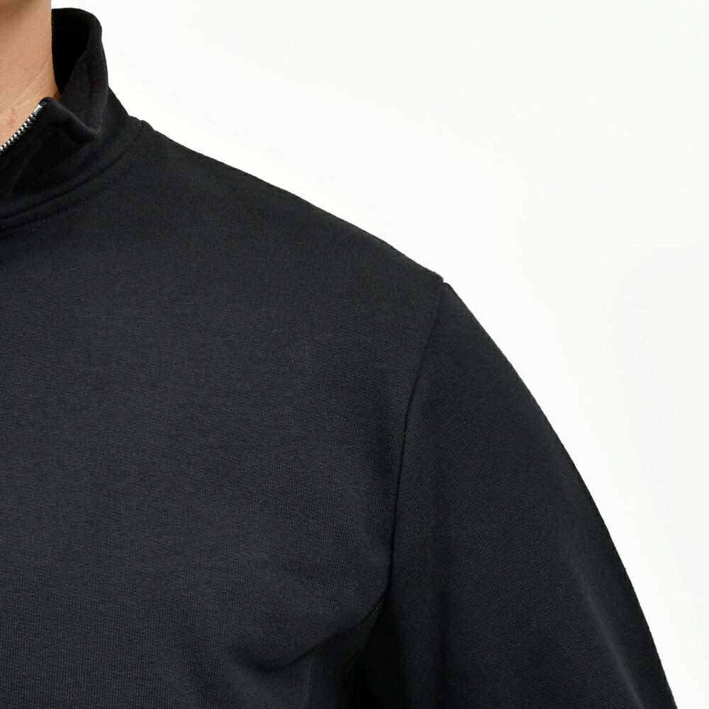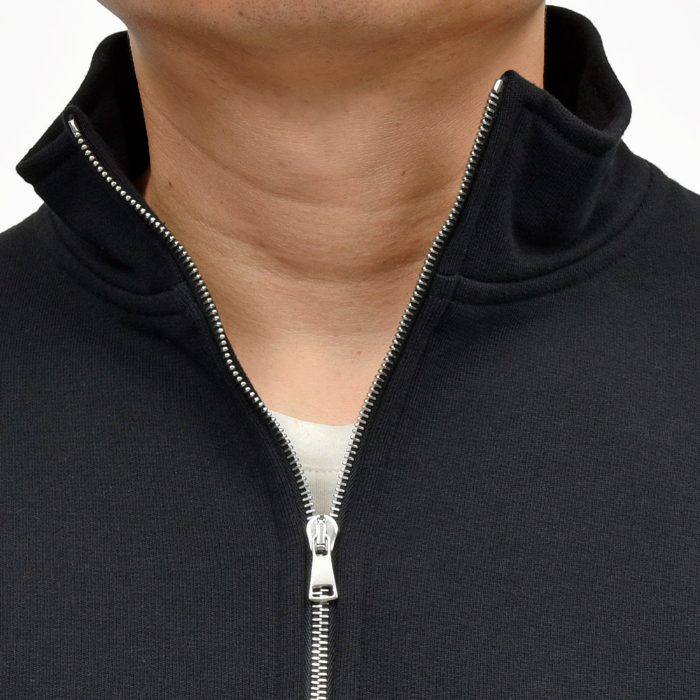ハイネックタイプのハーフジップで真夏以外着られる裏毛タイプのコットン100%スウェット生地。