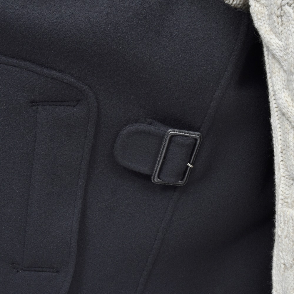 バックベルトはディティールとして最も作り込んでいる部分でして、通常は縫い付け、アジャストはセンターのボタンで行うところ、コート内側にバックルを備えることで普通のベルトのように絞りを調整できるようになっています。