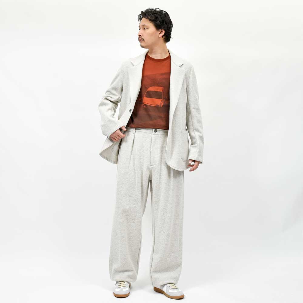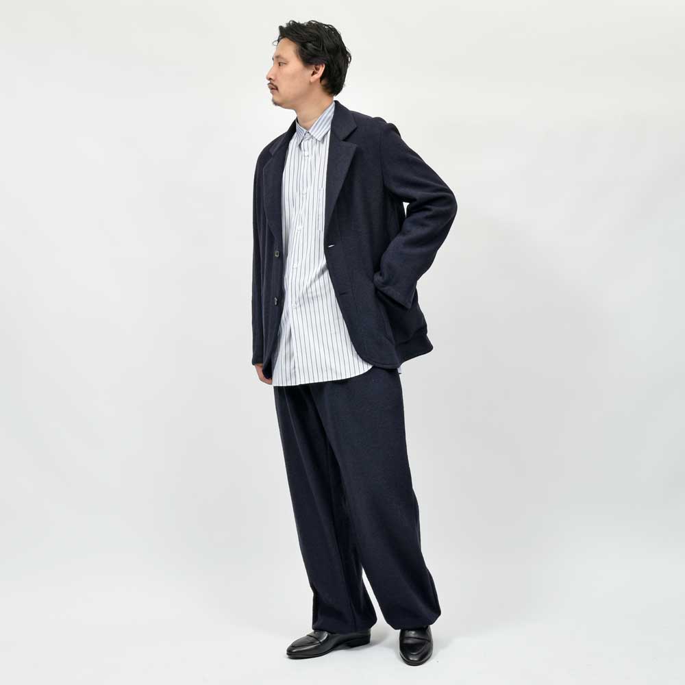 共生地のイージーパンツと組み合わせることによって洒脱なセットアップスタイルが完成しますので、そちらもぜひ。