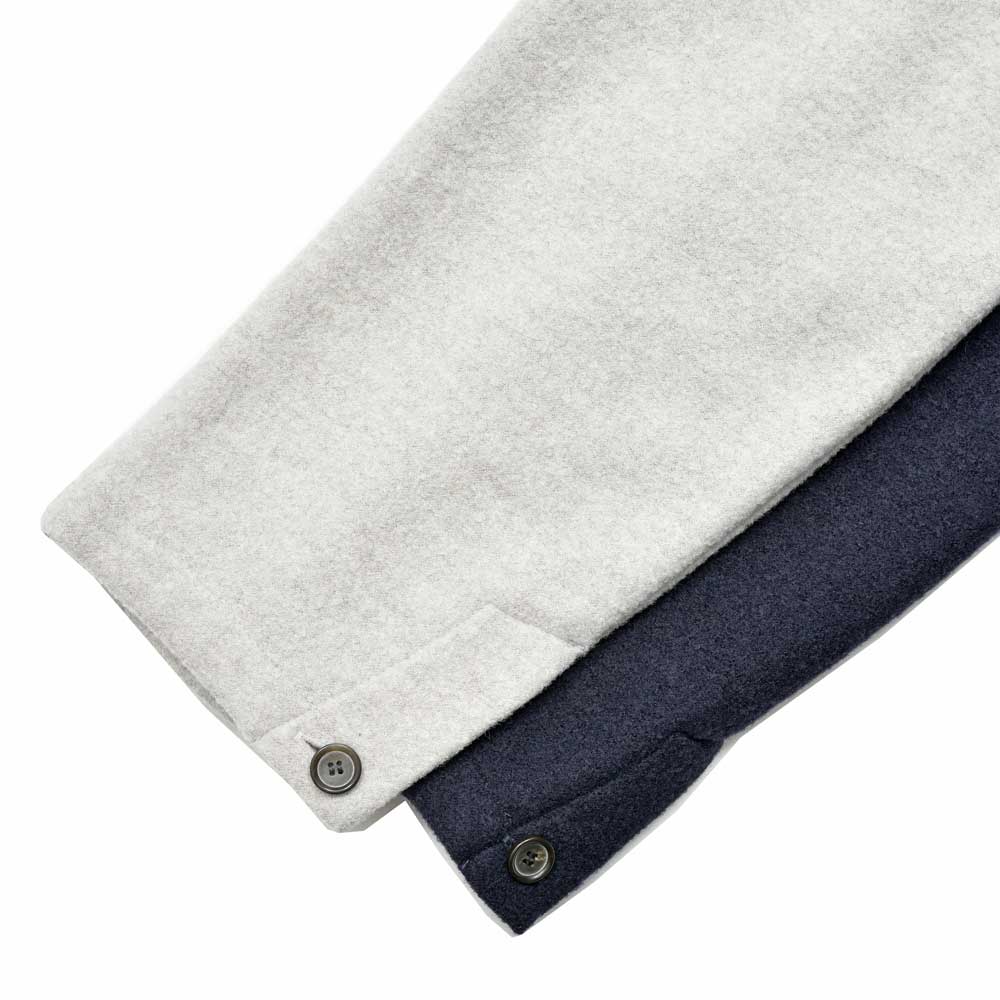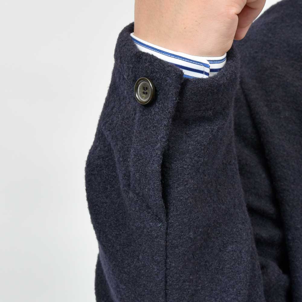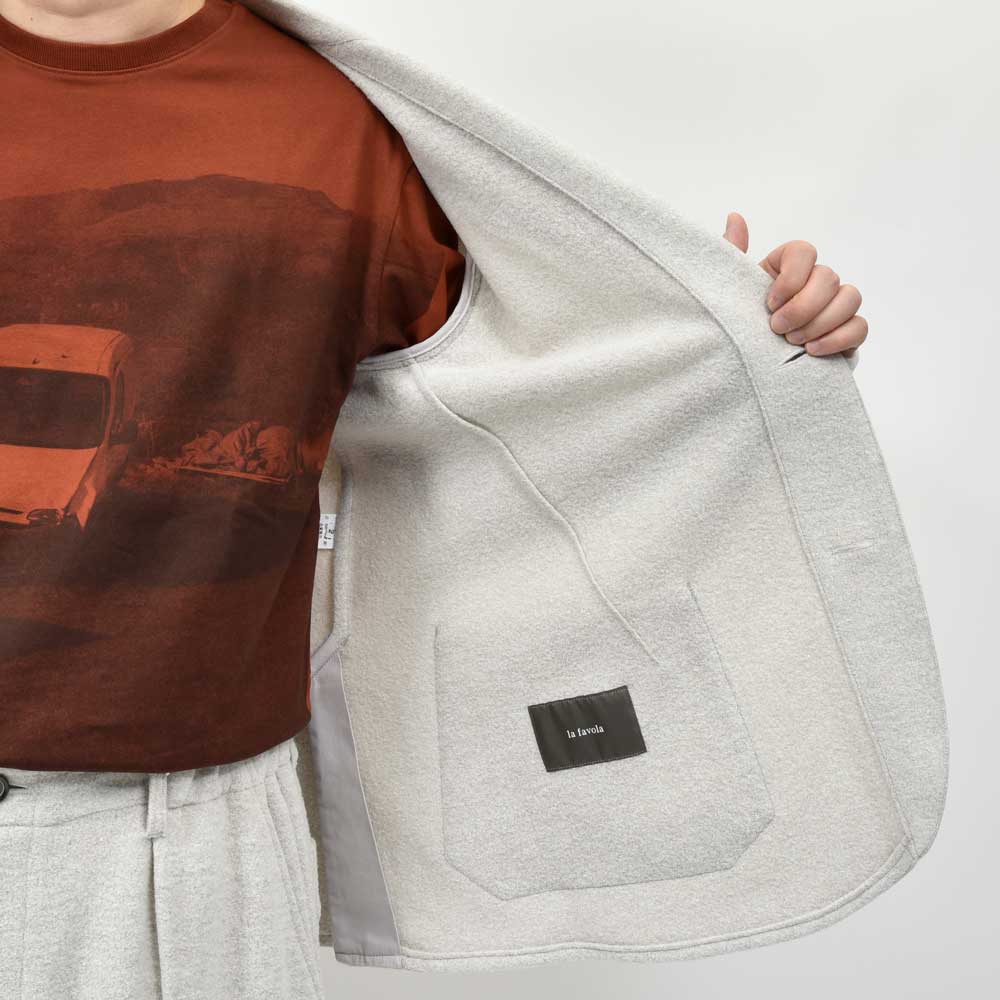 テーラーリングを得意とするla favola(ラファーヴォラ)だからこそ、ここまでカジュアルなジャケットであっても凛とした空気を感じさせるのかもしれません。生地はウールナイロンのジャージをセレクトしていまして、ウォーム感のあるタッチに。