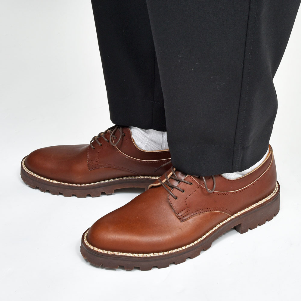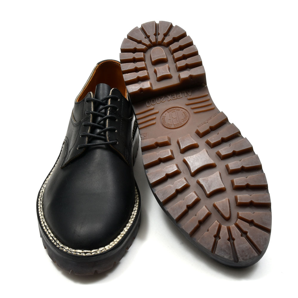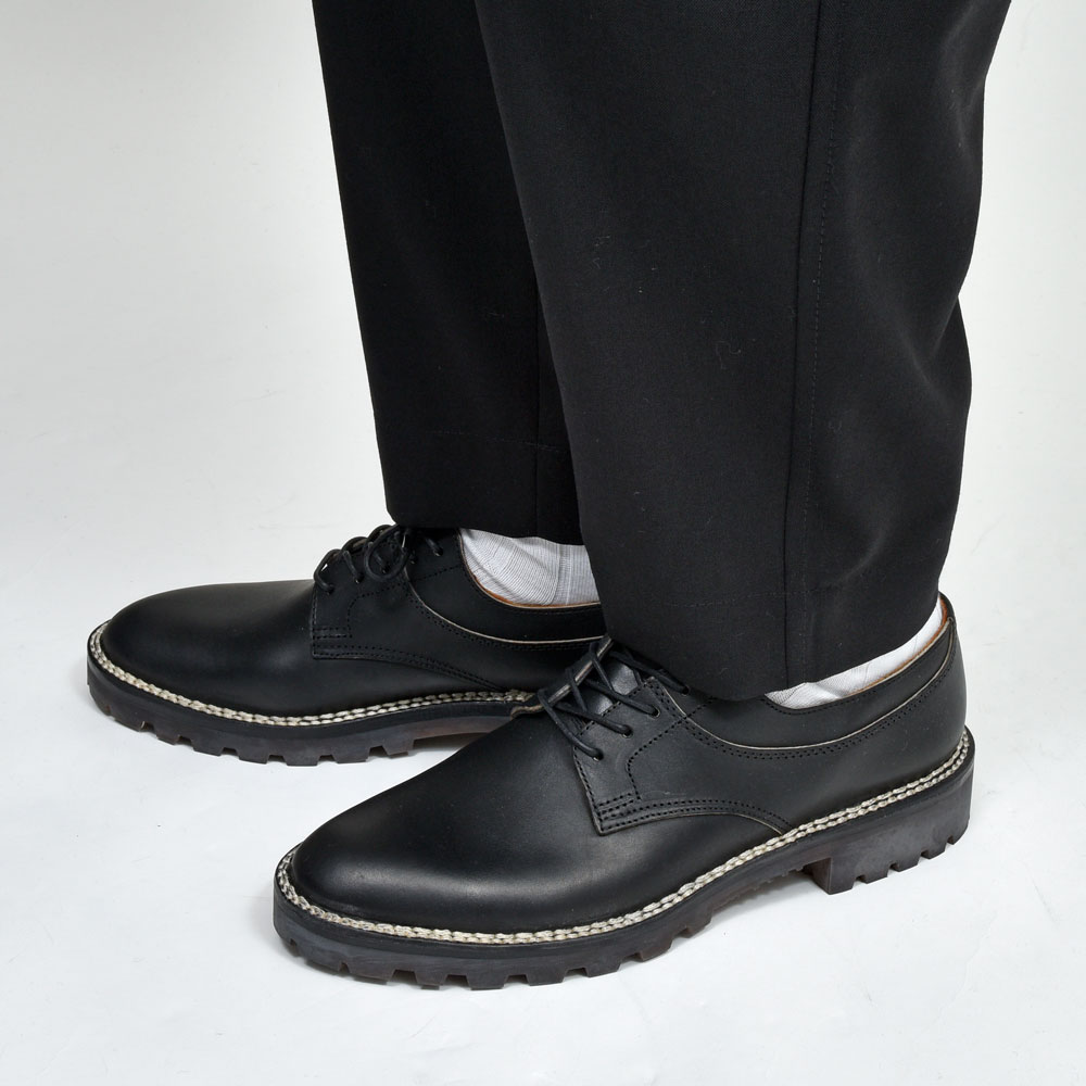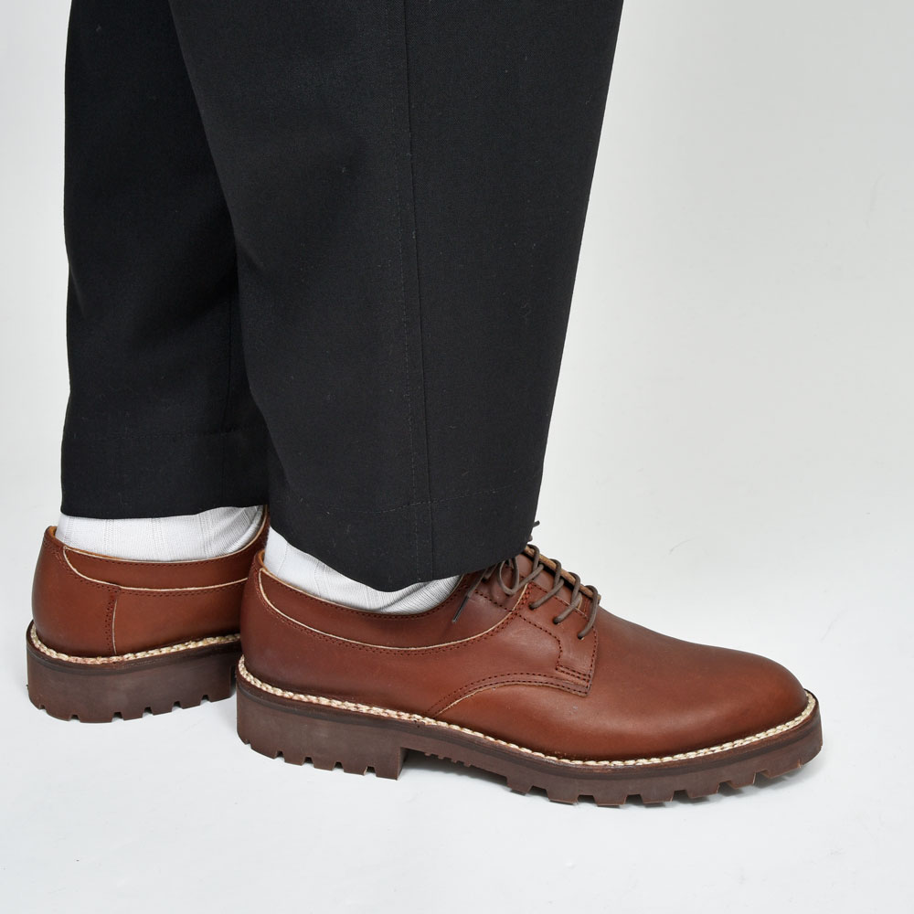 今回セレクトしたのはダービーシューズ、シルエットは比較的シャープになっていまして、やや甲も低め、こういったところにもフランスのムードが感じられます。製法はダブルステッチダウンを採用、雨に強く柔軟性も備えているため日常使いにもぴったりではないでしょうか。