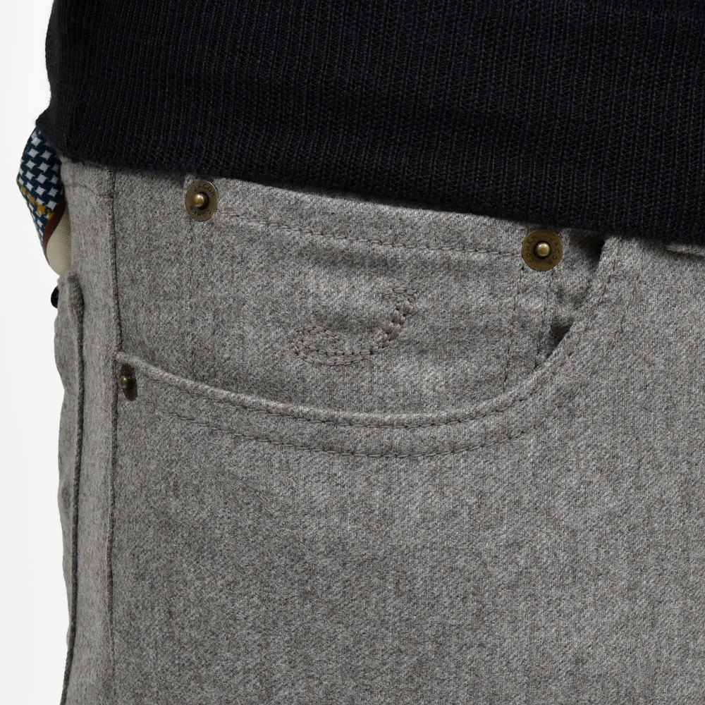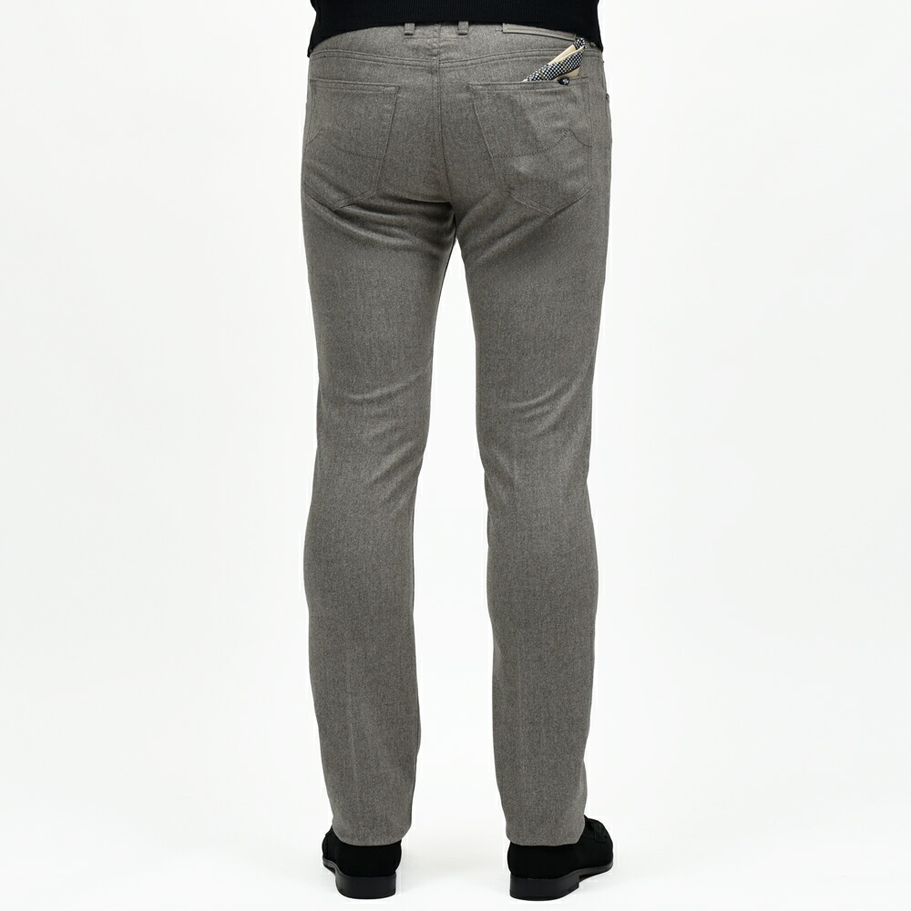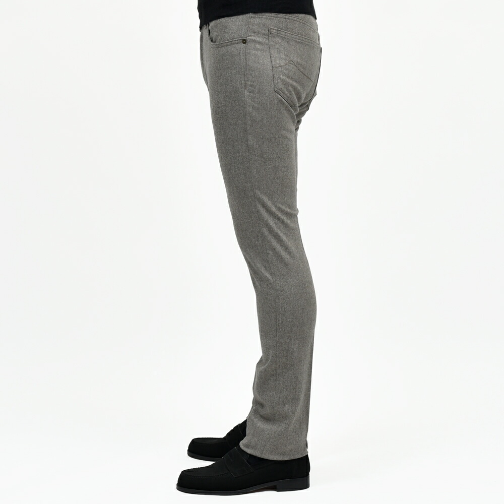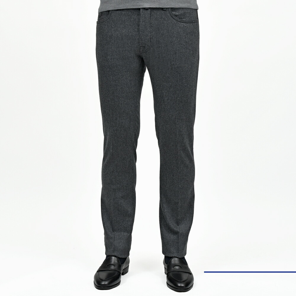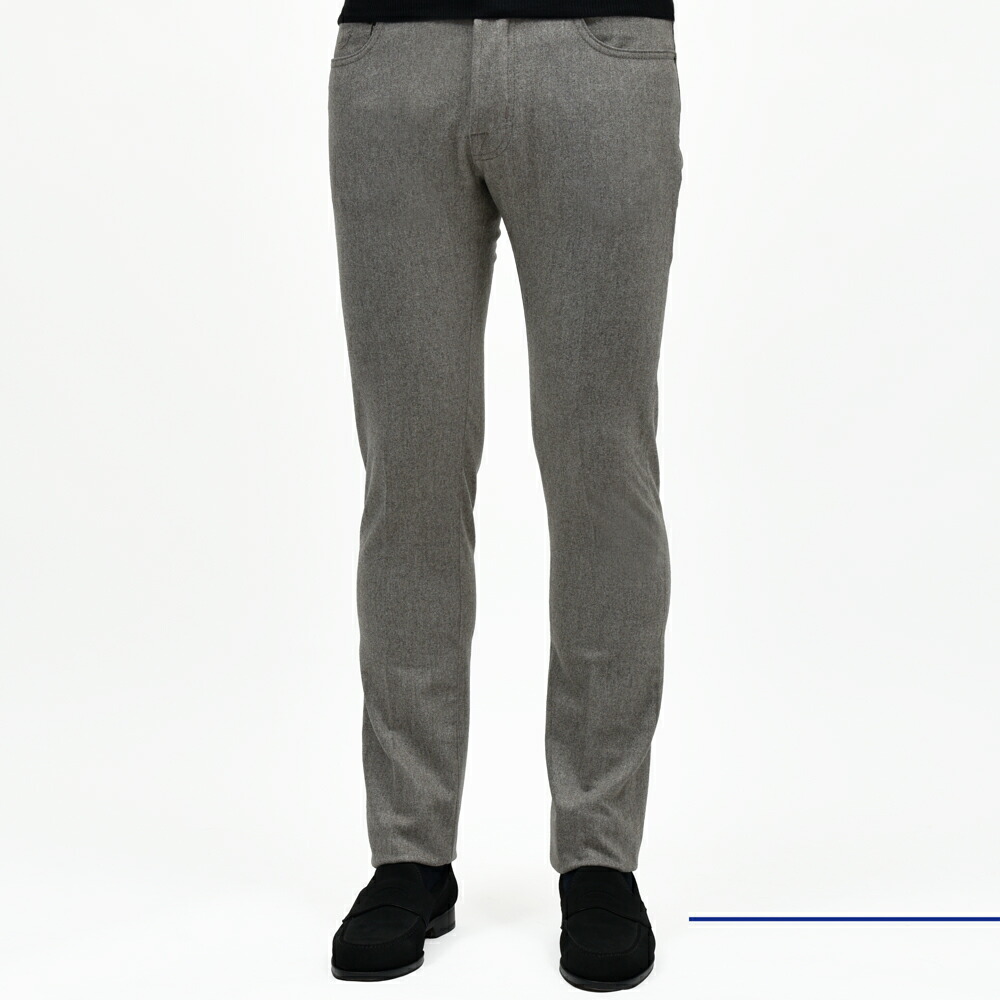 デニムブランドとして名高いJACOB COHEN(ヤコブ コーエン)ですが、こちらは上質なウールフランネルを採用した5ポケットパンツ。生地にはCANONICO社のSUPER SONICを用いており、ソフトな風合いと抜群のストレッチ性を兼ね備えています。見た目は端正ながらも穿き心地は快適で、デニムとはまた違った上品なリラックス感を味わえます。