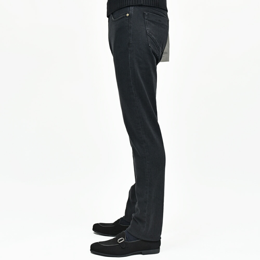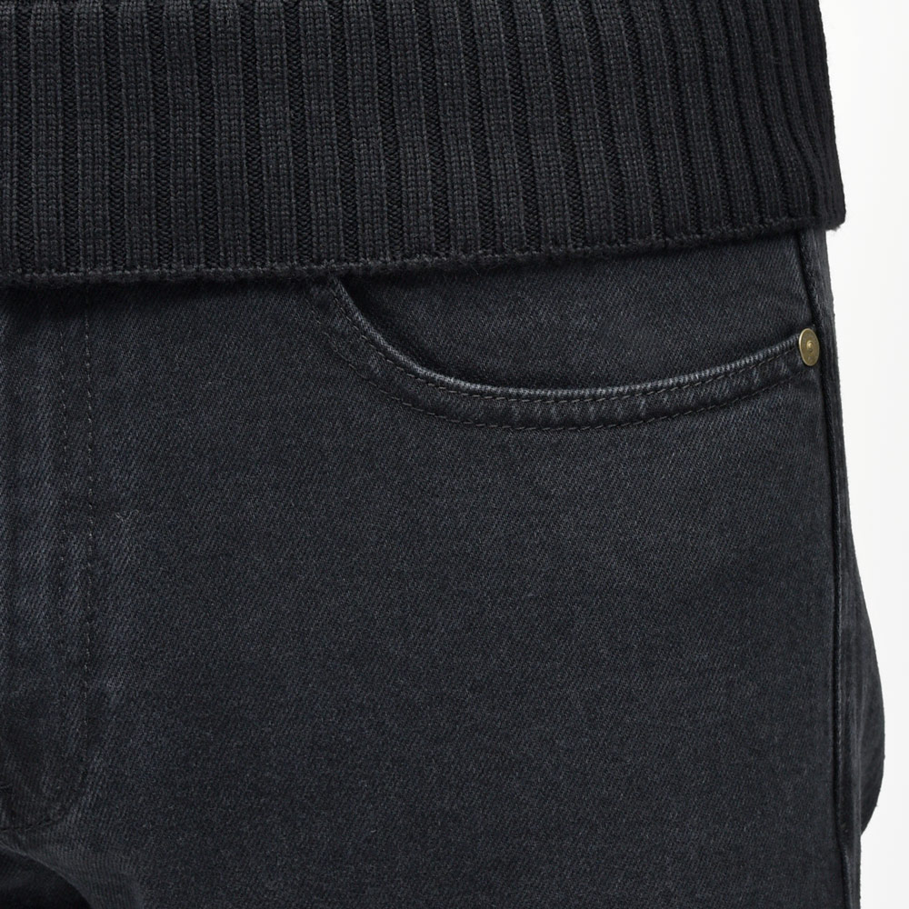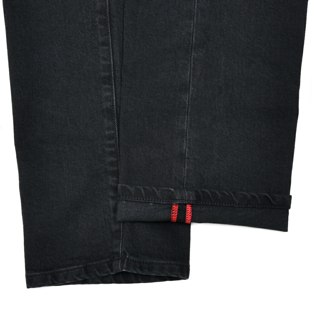 ブラックデニム、加工を繰り返すと色がフェードしてグレーに近づいていきますが、こちらはブラックで、ヒゲやクラッシュなどの加工はなし。シンプルに洗いを掛けたくらいのクリーンなタイプなので、ジャケットやレザーブルゾンを合わせた上品なスタイルがよく似合うと思います。