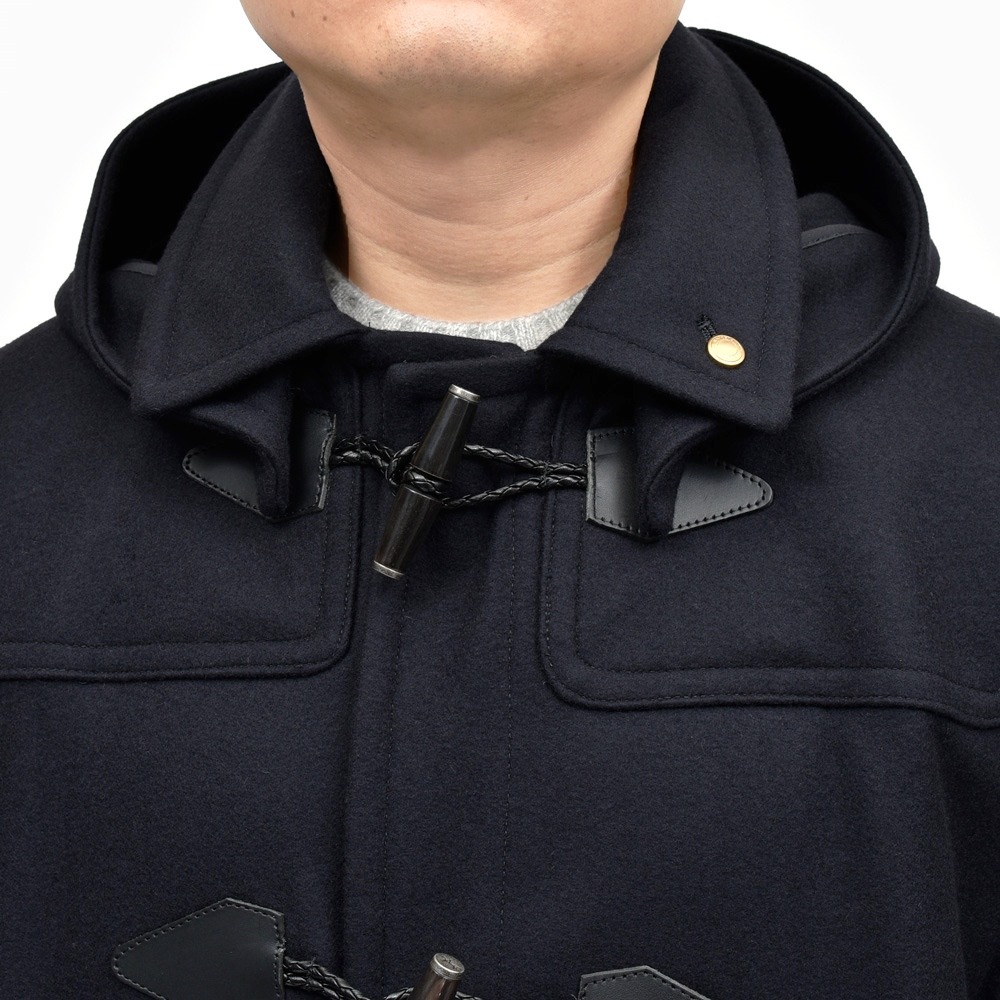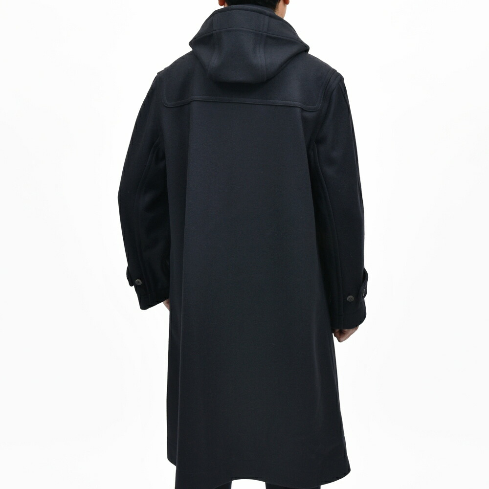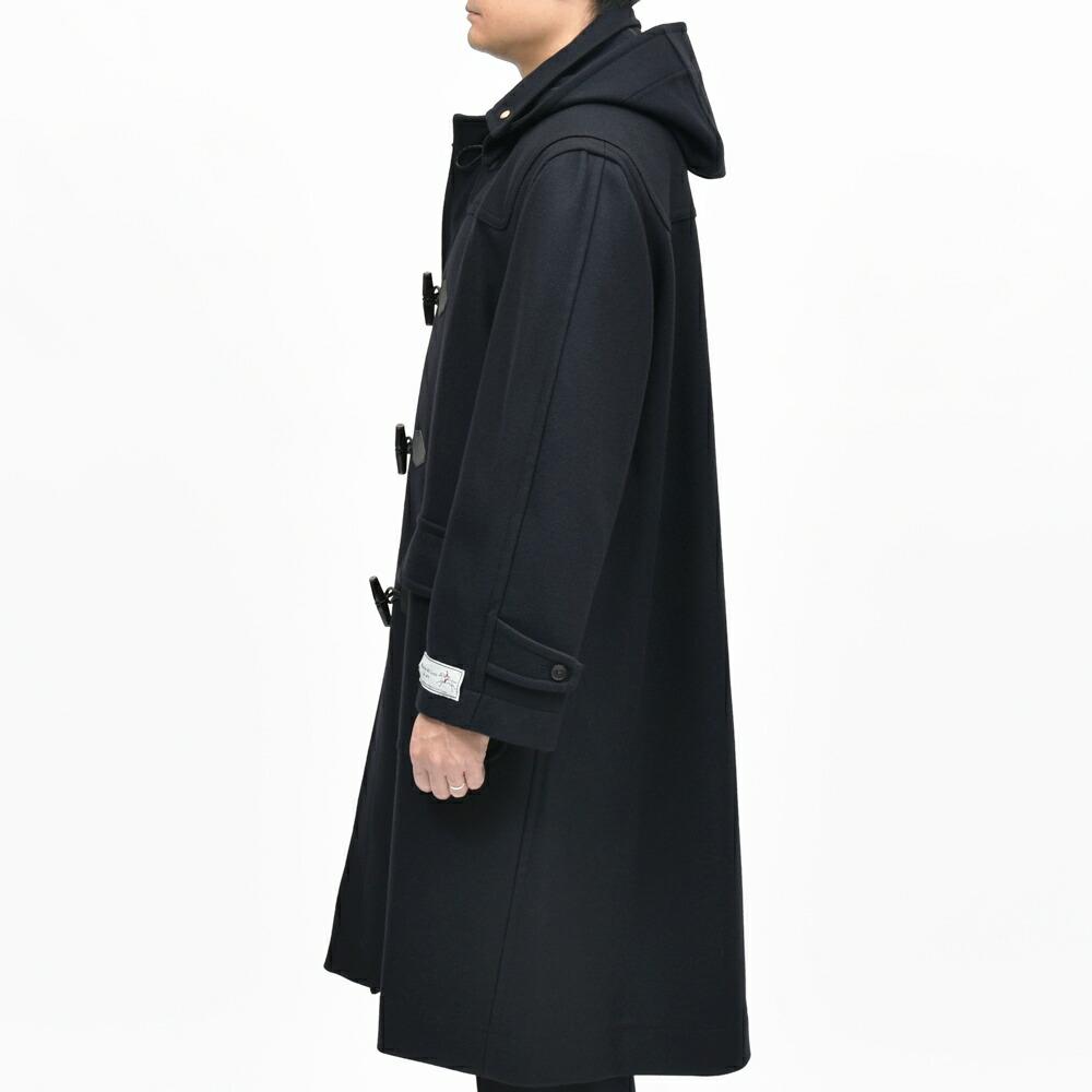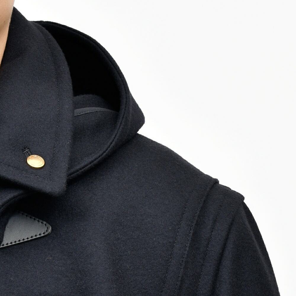 たっぷりとしたシルエットのダッフルコートで、ホーントグルや刻印入りのメタルパーツ、本革のメッシュループなど細部までこだわり抜いた仕様を採用。