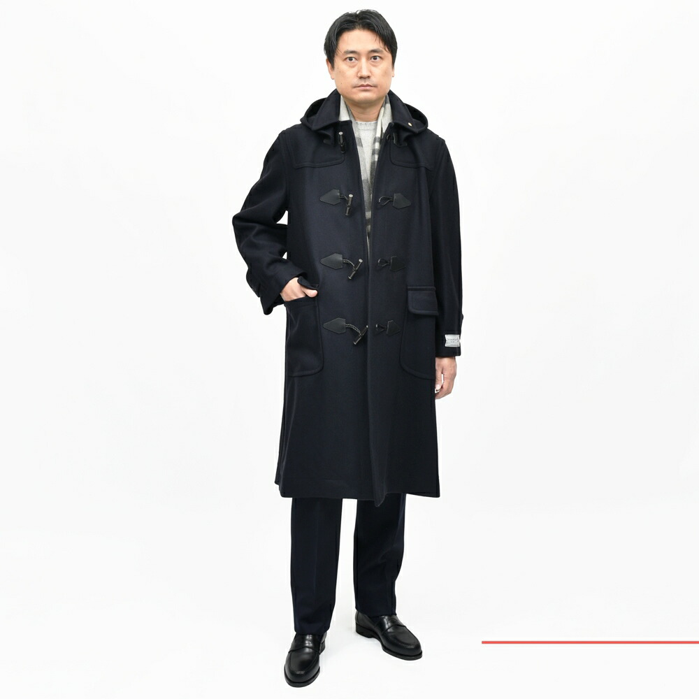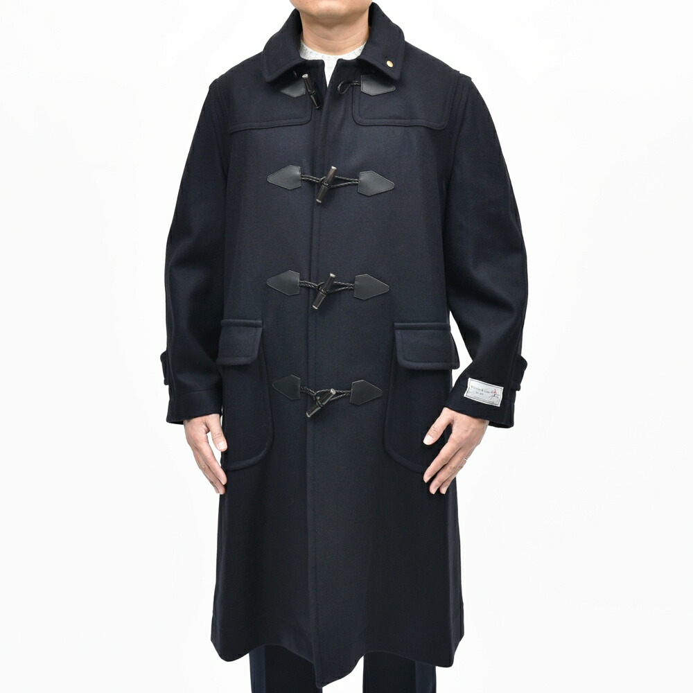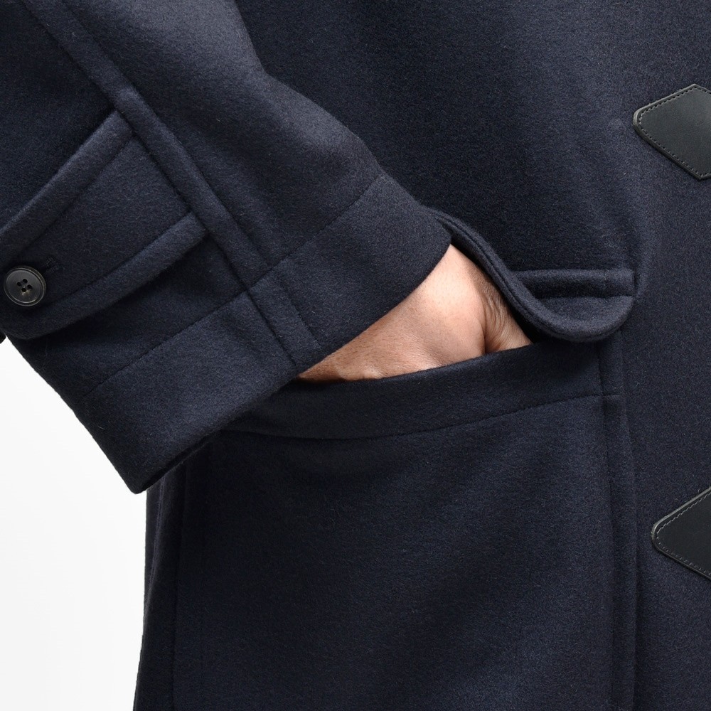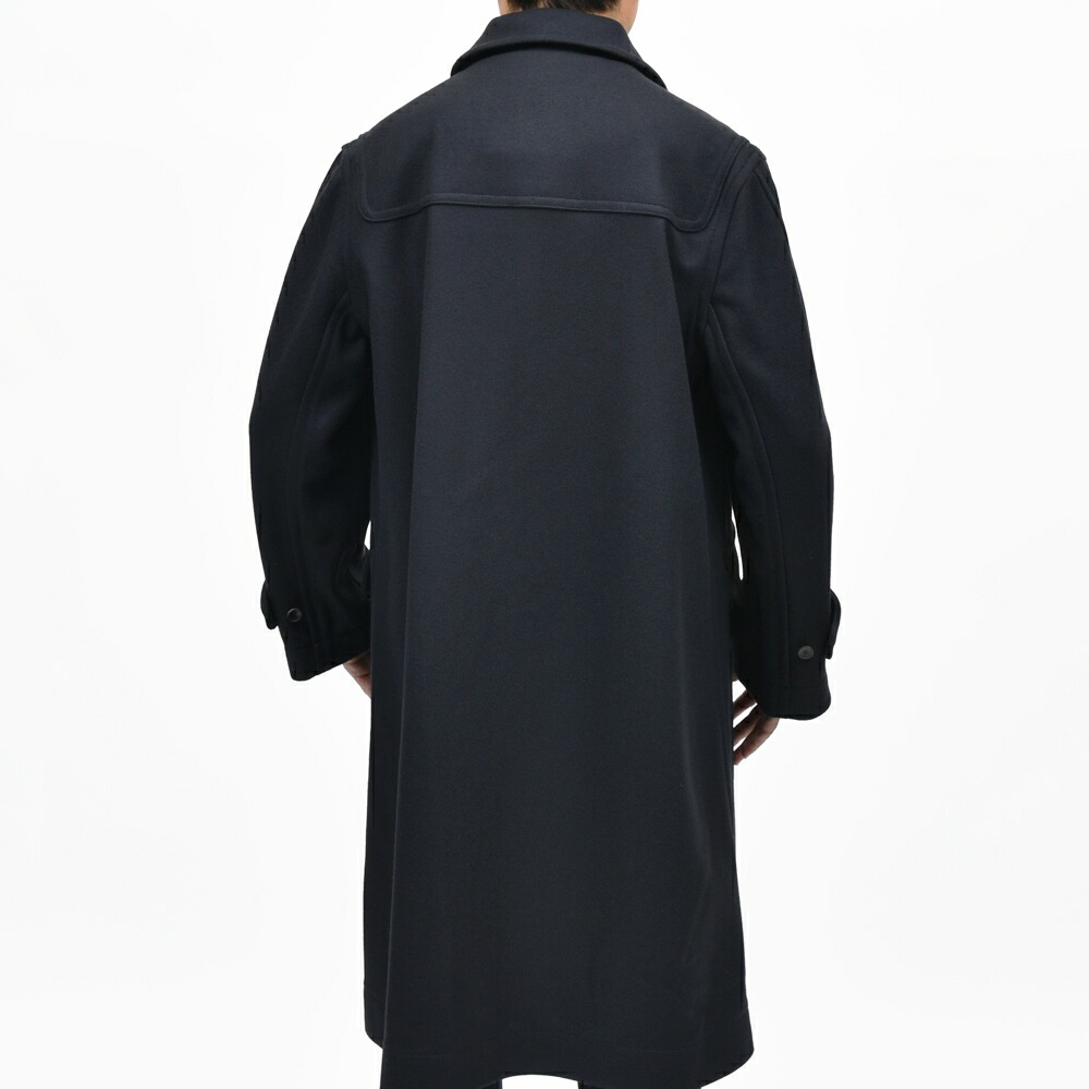 たっぷりとしたシルエットのダッフルコートで、ホーントグルや刻印入りのメタルパーツ、本革のメッシュループなど細部までこだわり抜いた仕様を採用。
