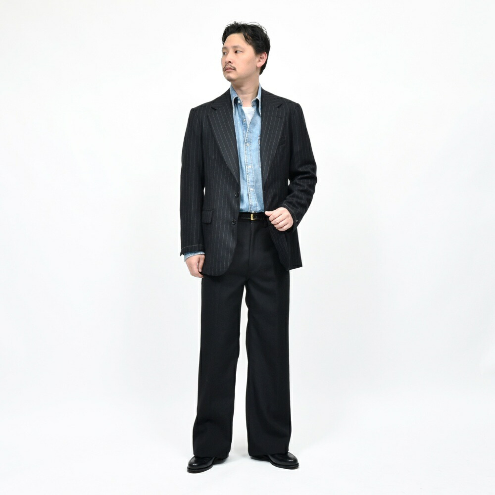 着崩すことが前提に作られたジャケットで、イブニング系といいますかかなりドレスよりの見え方になりますが、それをあえてカットソーやデニムなどワーク・カジュアルなものと合わせて欲しい。そうすることで雰囲気がクリーンすぎず、日常に寄り添ったドレスダウンスタイルになり、ひいてはシーズンテーマである「ニュートラル」なものになる・・・というお言葉でした。 カチッとしているように見えて、かなり軽いです。上襟の形状が独特で、少し外に逃げるイメージでしょうか。平氏らしいアクセントになっていて、他にはない独特なバランスのジャケットに仕上がっていると思います。 スタッフ 西出 |