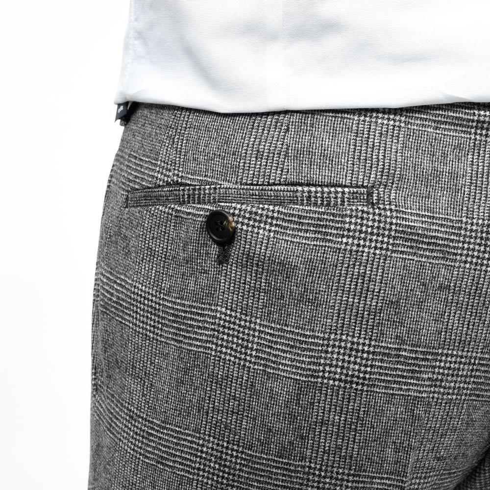 ウールにわずかにカシミヤを加えた生地は、グレンチェックの端正さに柔らかな奥行きを与え、触れた際の滑らかさからも上質さが実感できます。