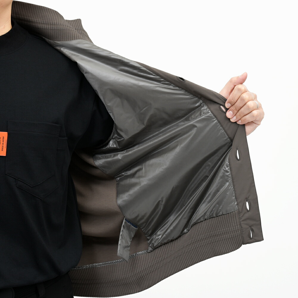 前身頃のナイロンはしなやかでストレッチ製があり、マットなタッチで高級感を感じさせますし、後身頃とスリーブのジャージファブリックは生地裏のタッチも表地同様のスムースさがあり、体の動きに合わせて伸縮するので運動性能も◎。