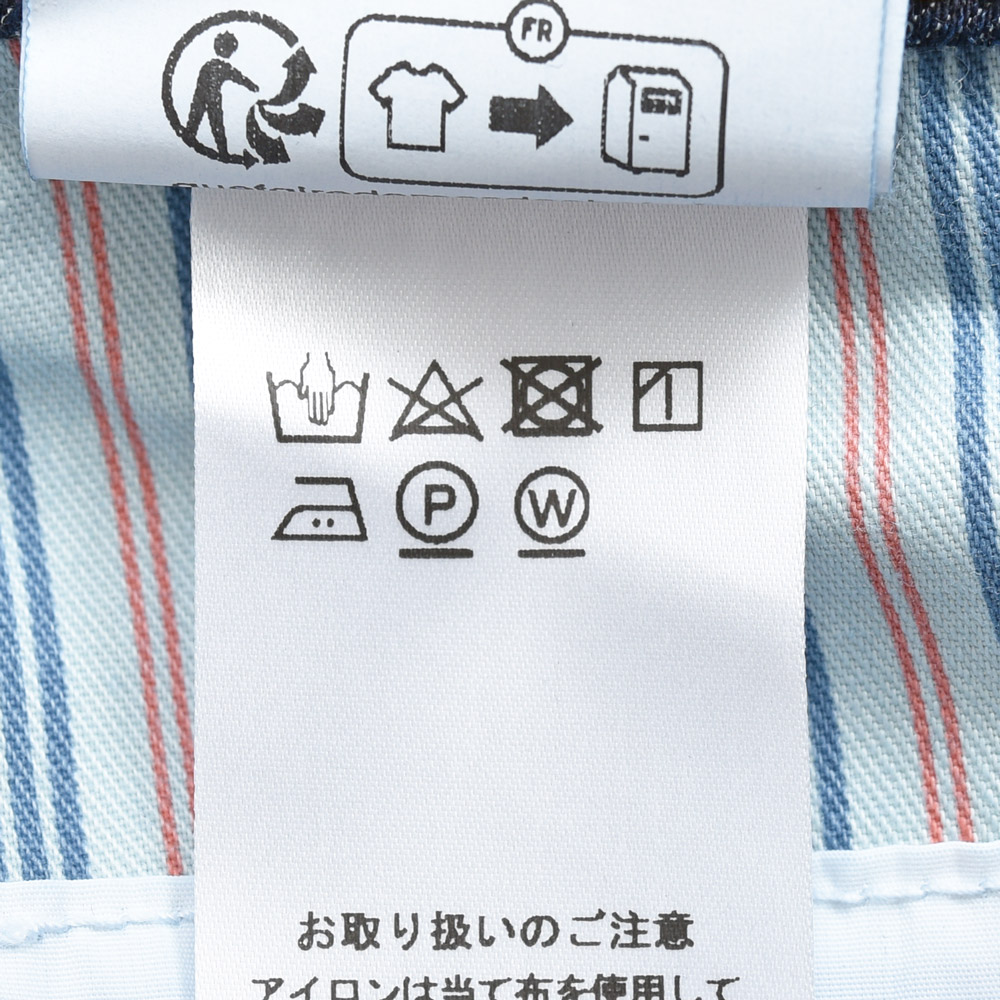 パーツ構成はシンプルにまとめられていまして、ステッチはネイビー、またバックパッチや一部ステッチにブラウンをポイントで用いてすっきりと統一感を出しています。素材にはコットンよりもレーヨンが多く含まれているので高いストレッチ性や肌触りの良さが特徴となります。全体的に整った端正な雰囲気がある仕上がりかと思います。