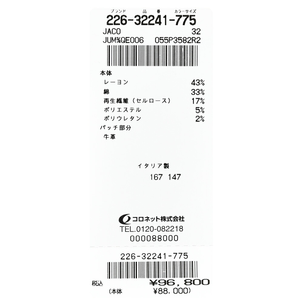 : 本体:レーヨン43% コットン33% セルロース17% ポリエステル5% ポリウレタン2%パッチ部分:牛革
