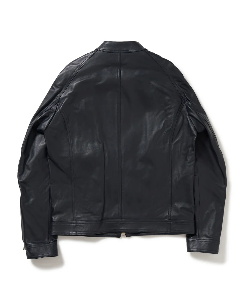 深みのあるネイビーカラーもレザージャケットならではの無骨な印象を軽減しています。
