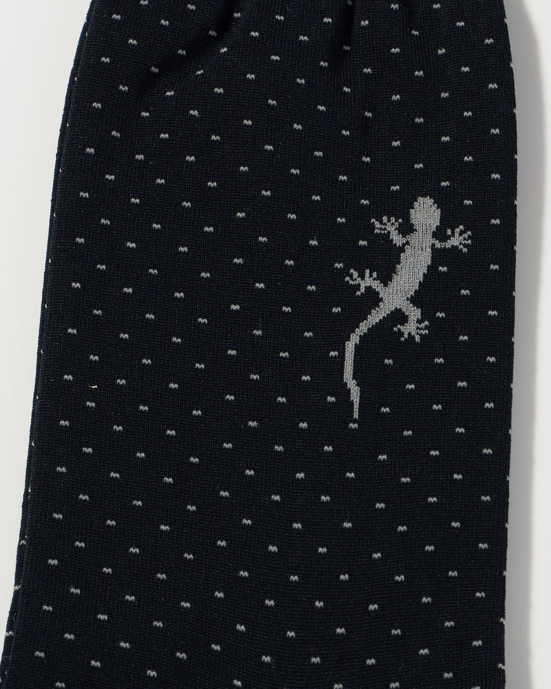 プレーンなピンドットソックスの片足にトカゲ(幸運のモチーフ)が歩いているユニークなデザイン。