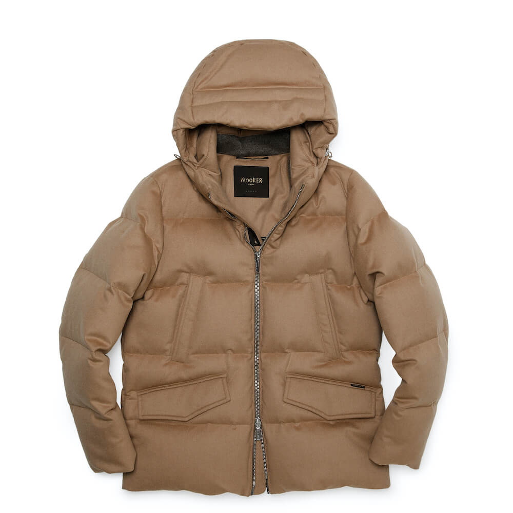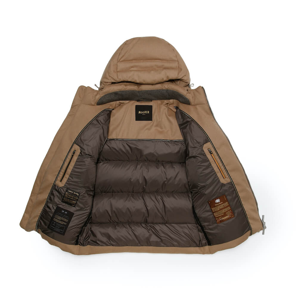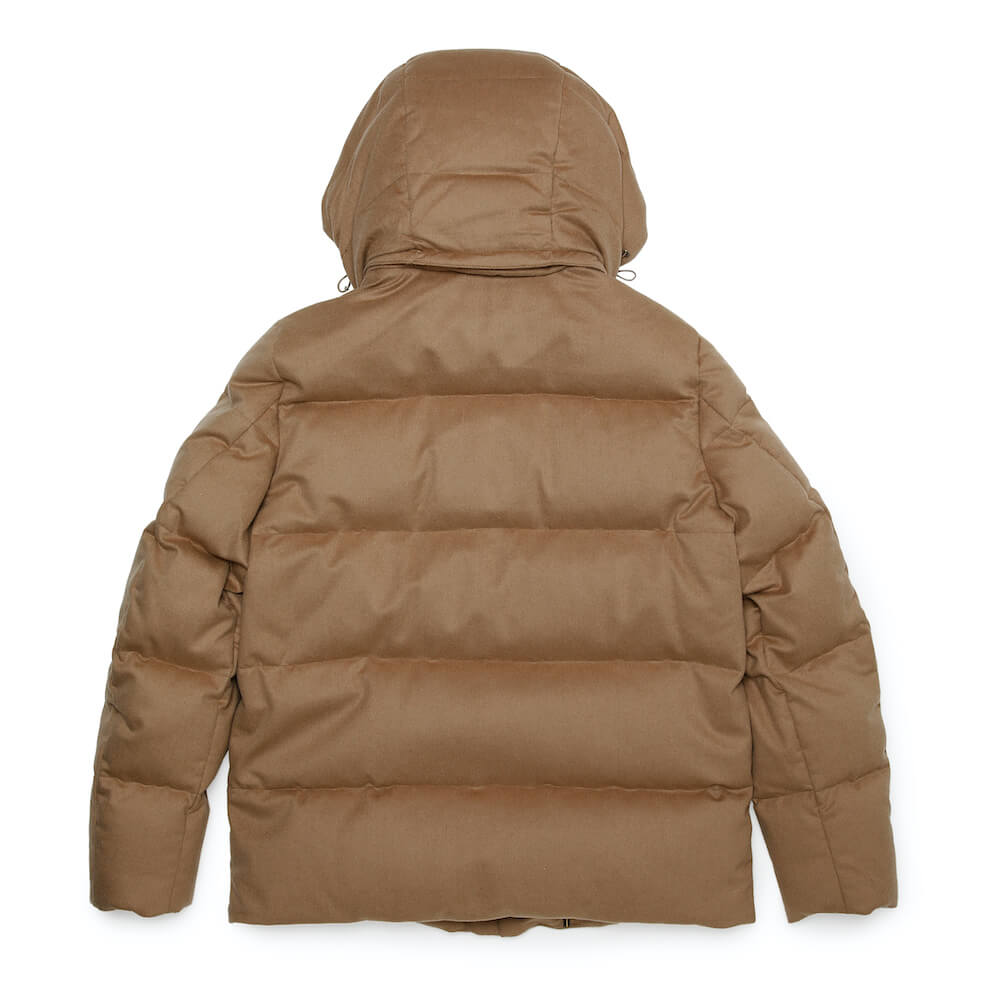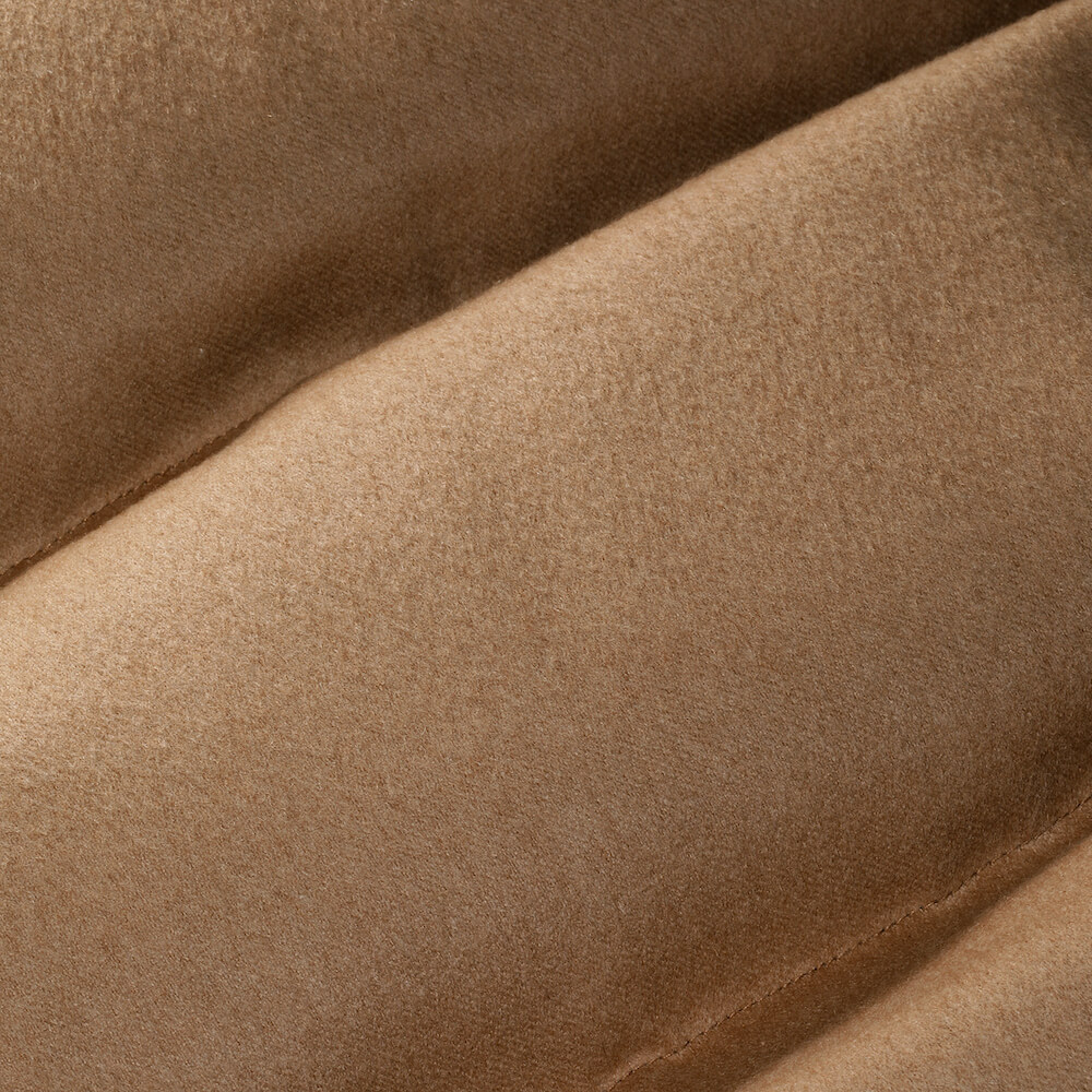 贅沢なキャメル(ラクダの毛)の質感が際立つダウンジャケット。ラグジュアリーな素材とワイドピッチのキルティングが特徴です。