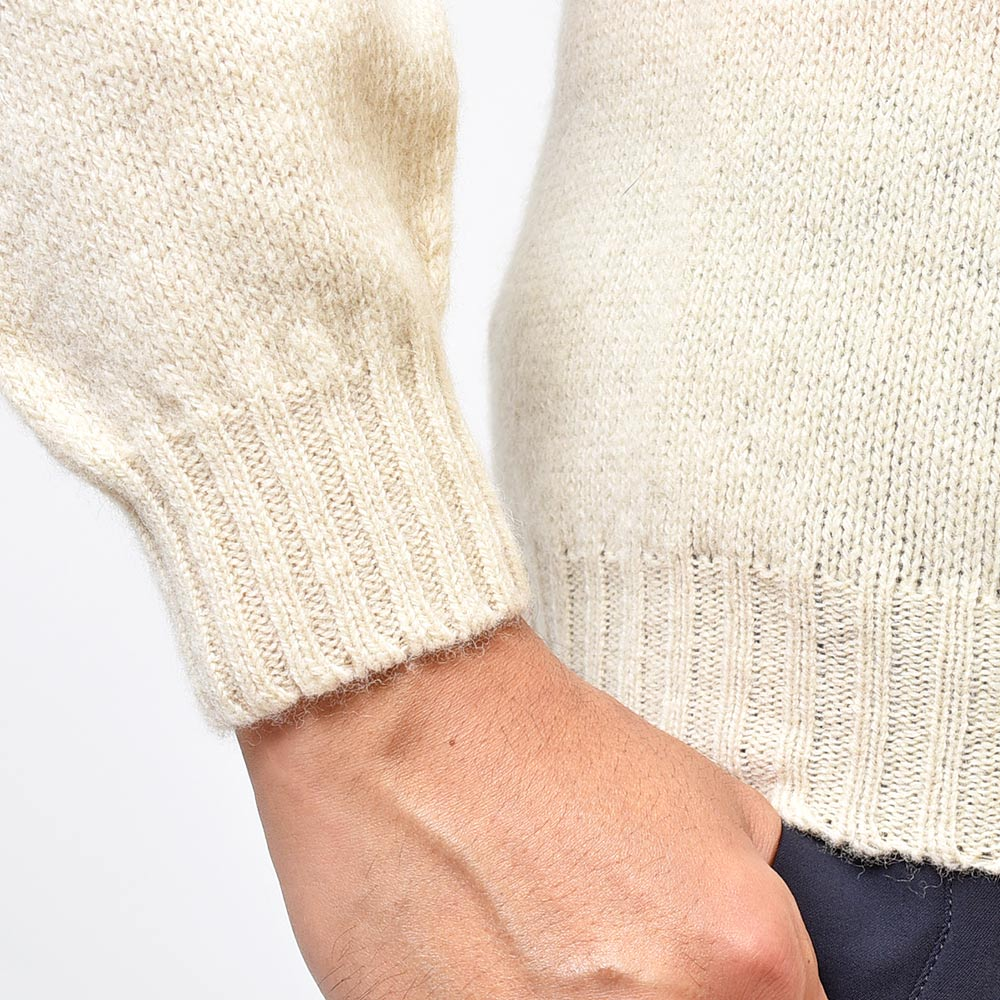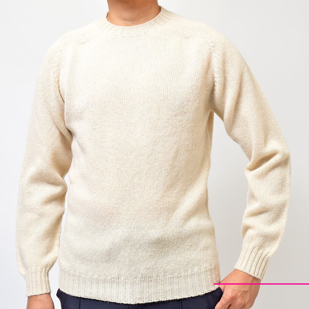セミハンドメイドで生産されるオーセンチックニットウエアは、生後6ヵ月未満の子羊の羊毛を古くから今に現存する伝統的編み機によって編みこまれ、仕上げはハンドフィニュッシュという伝統を残しつつも時代性に合わせたライン。独特の味わい深い発色と、驚くほど軽やかな着心地は唯一無二です。