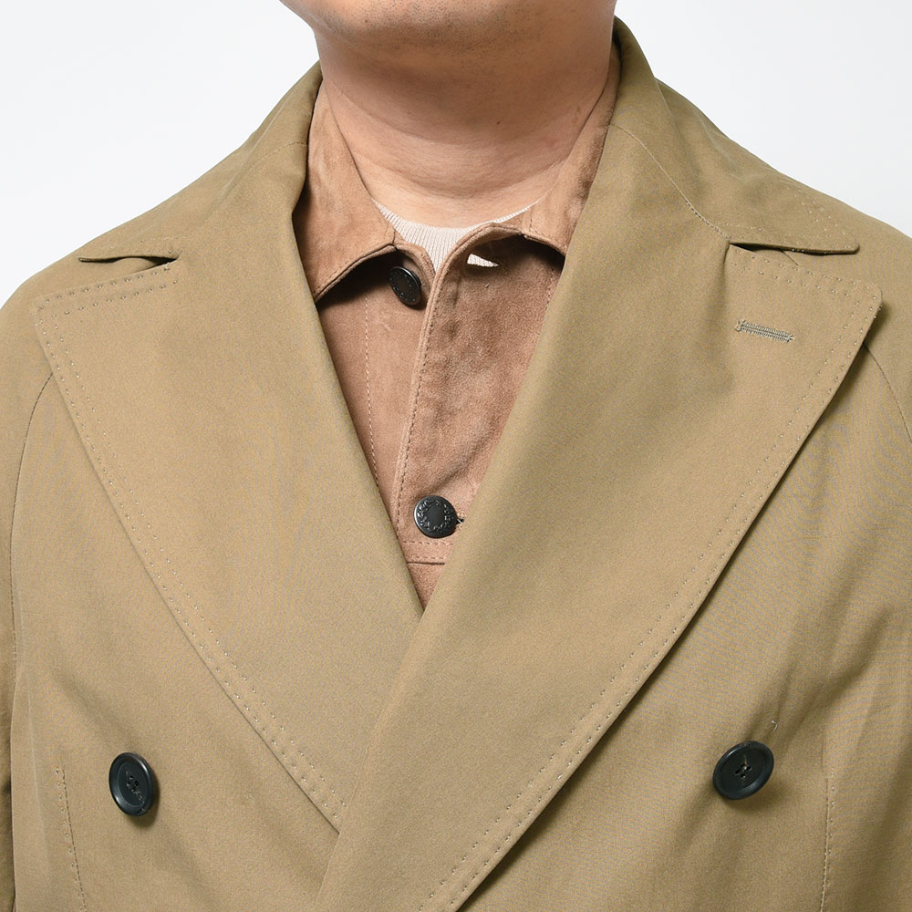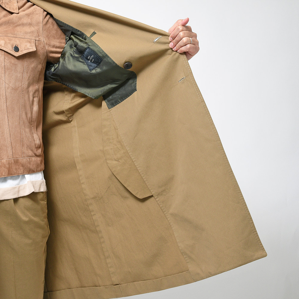 こちらは、1858年にイギリスのヨークシャーで創業された老舗コットンメーカー“Brisbane Moss(ブリスベンモス)”の目付け215gのライトウエイトなコットン素材を使用。軽い目付けではありますが、生地に張りがあり頼り無さは皆無。ややブラウンがかったベージュがコットン素材と相まって、枯れたような男性の色気を掻き立ててくれるかのような佇まいです。
