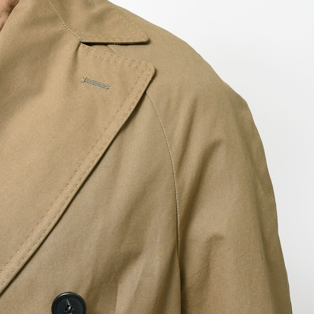 こちらのラグランスリーブコートは、いつも通りのサイズを着るとオーバーサイズシルエット。ワンサイズ落とすとややドレスライクなキレイめにも着れるシルエットになります。袖は可動域を確保した3枚はぎ仕立て、さらにラグランスリーブで一番の難所である肩付けは非常に美しく、そしてナチュラルな落ち感に仕上げた秀逸なモデルになります。