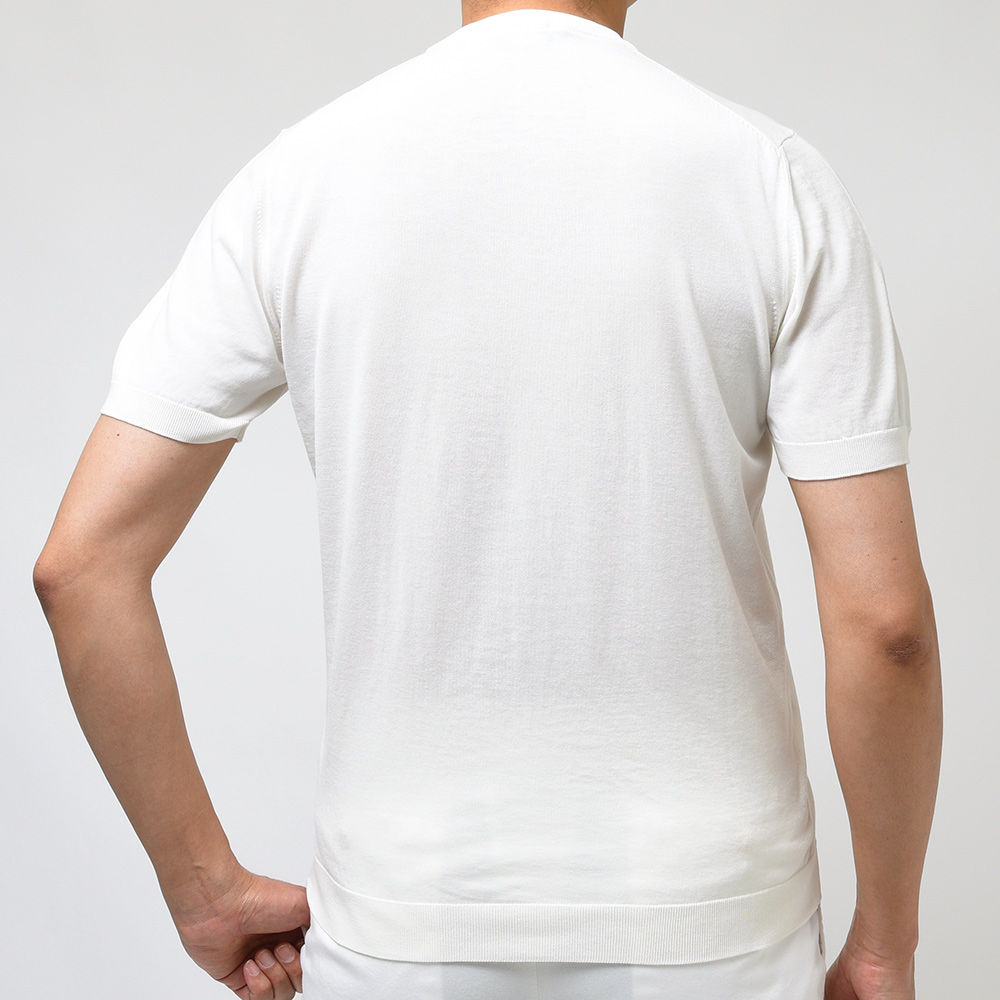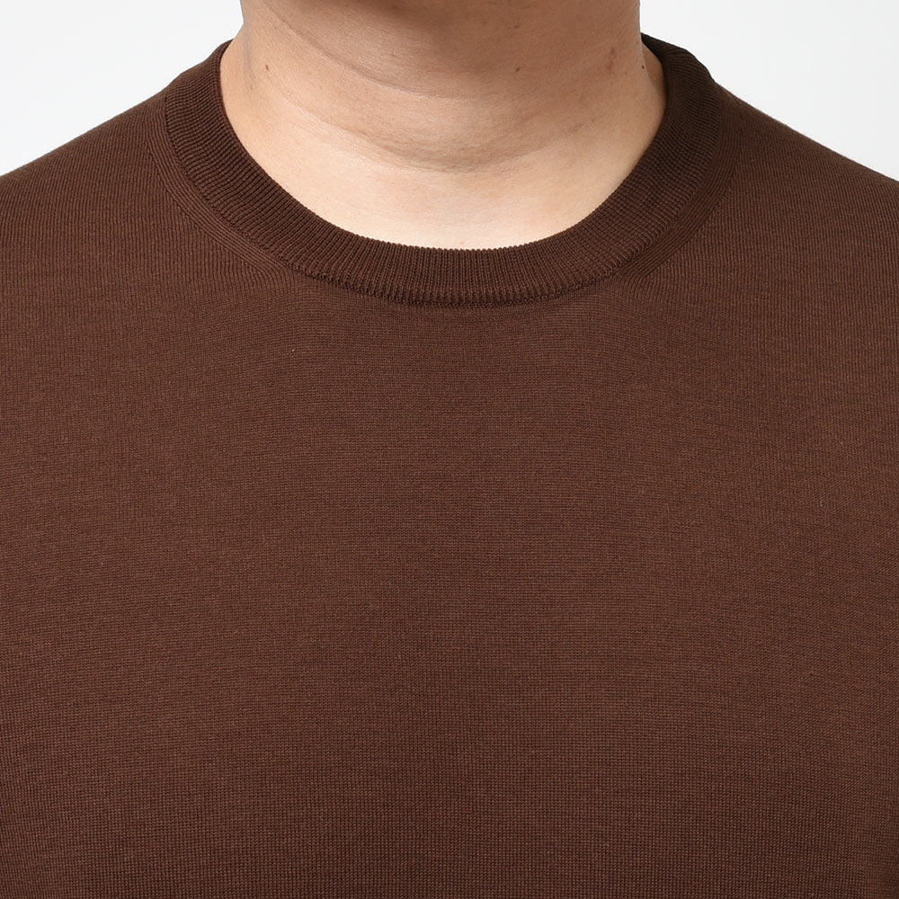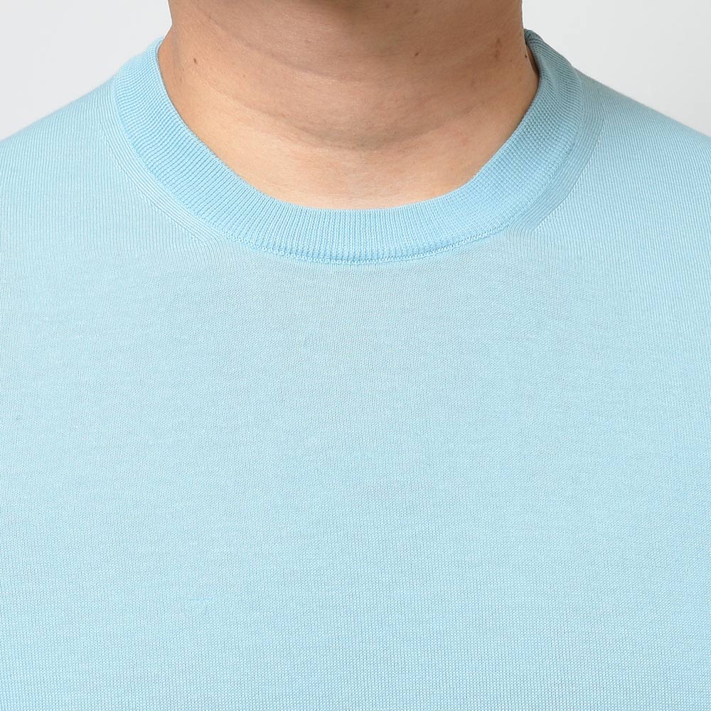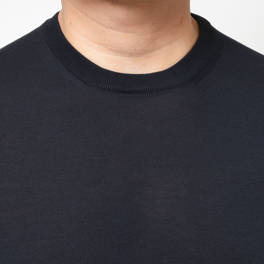 滑らかなでありながらも、ほんのりとシャリっとした肌触りが気持ちいいコットン素材を使用したハイゲージニットは、ネックが詰まり気味のクルーネックタイプ。首回りが詰まっているため上品な見え方となり、ジャケットとの相性はバツグンです。カットソー感覚で着用してなんら問題のない上質な質感が、もうカットソーには戻れない体となってしまう危険性を含んでいます。