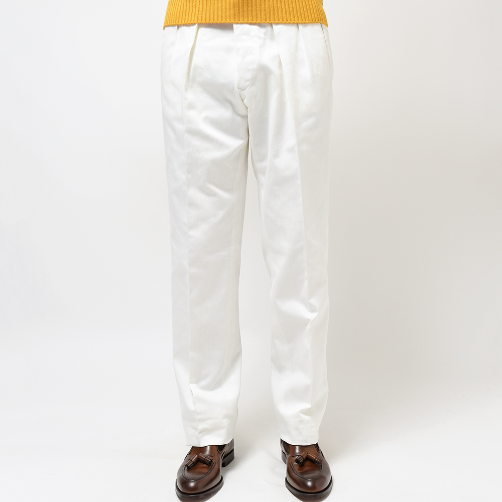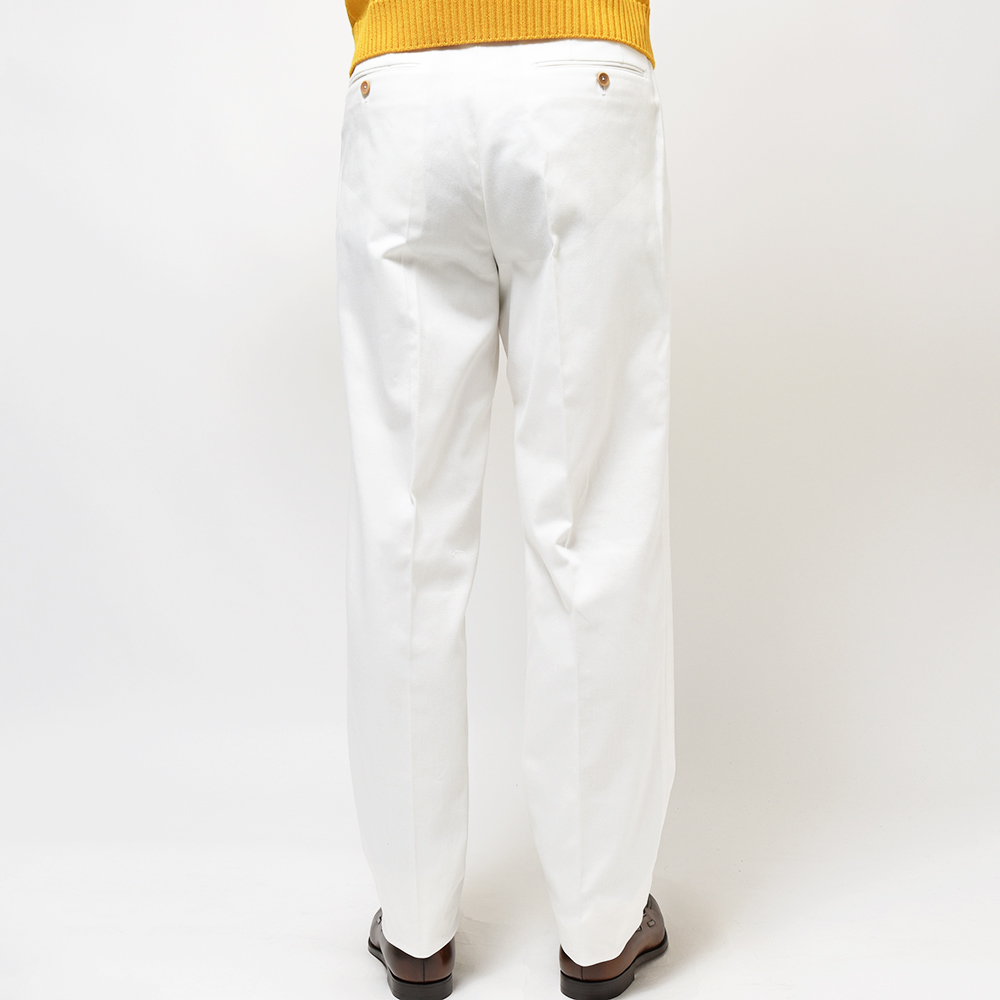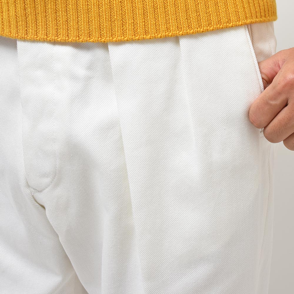 目付け450gの薄すぎず厚すぎない、良い塩梅のコットンツイルを使用したコチラは、ピュアホワイトと言うよりも、ほんのりと生成りがかったホワイトですので色馴染みの良い一本。いつもの白パンやホワイトデニムをワイドなシルエットにするだけで、スタイリングの見え方がガラッと変わるので、気分を変えるにはもってこいではないでしょうか。