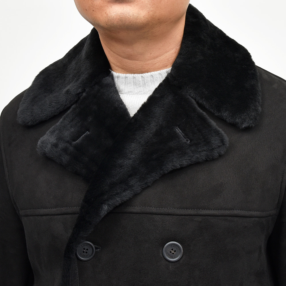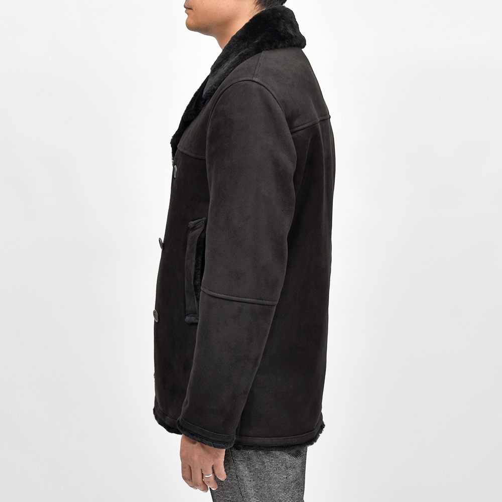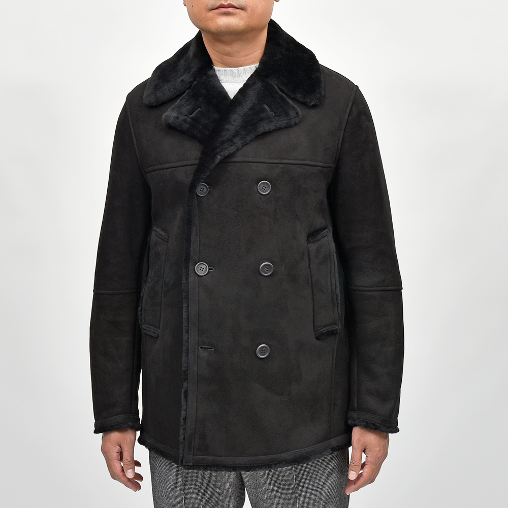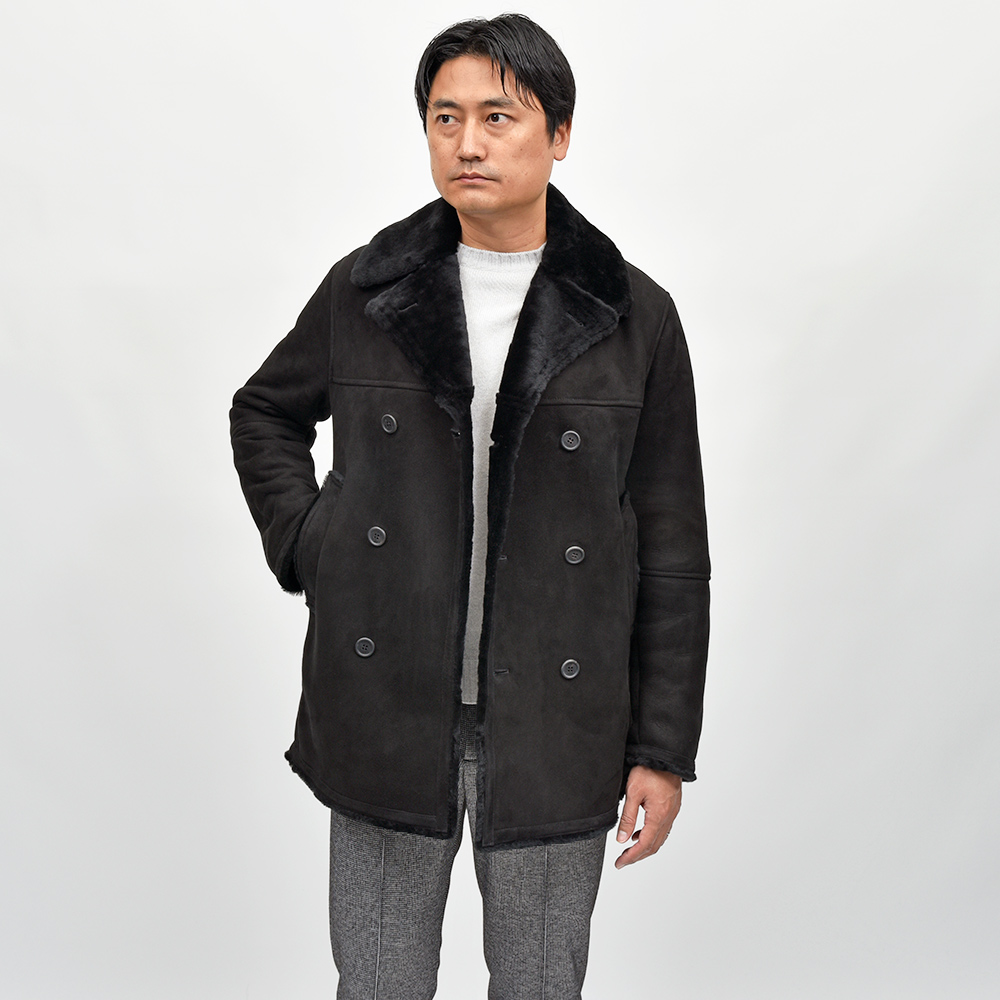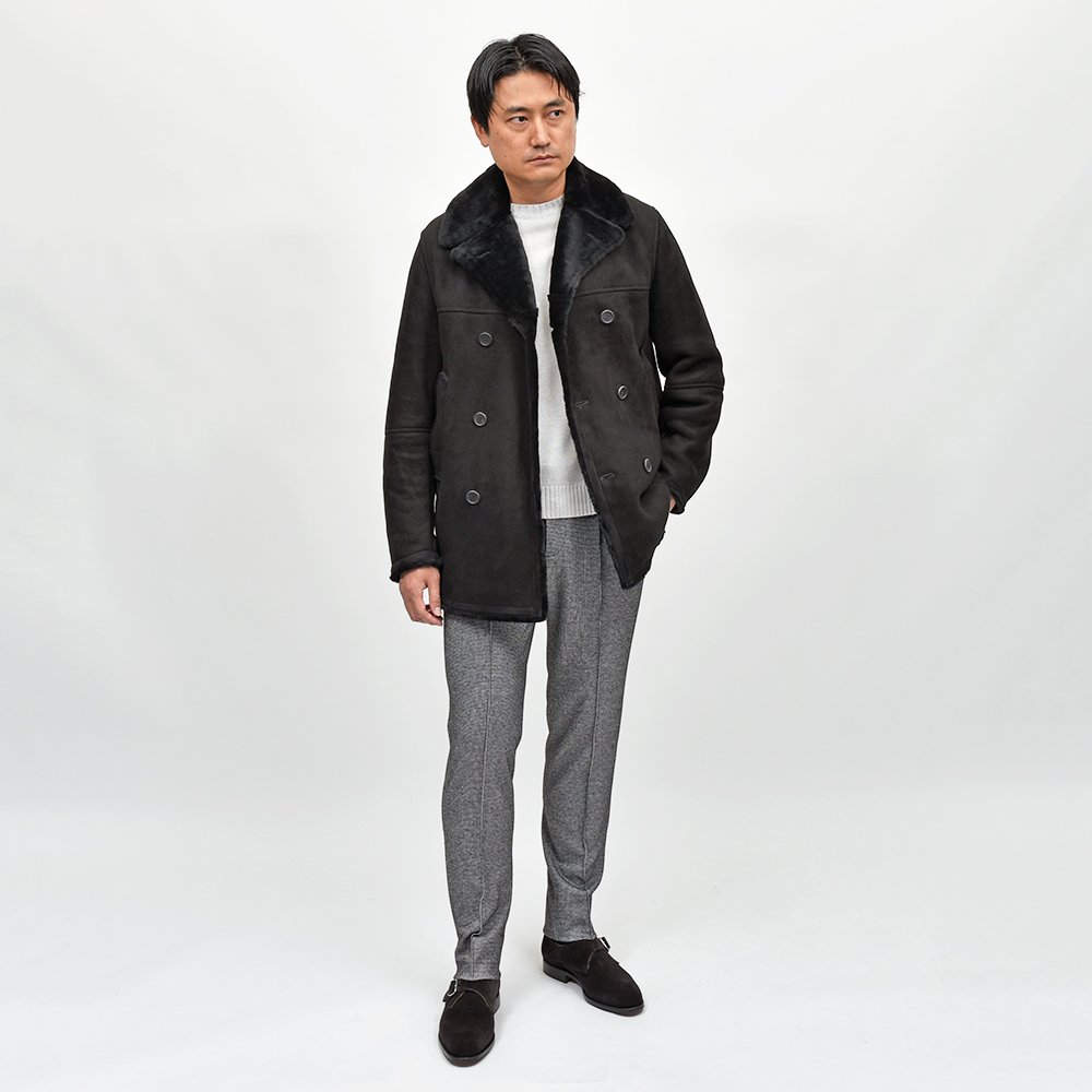 Pコートをベースとしたモデル"AVON(エイボン)"。コチラは、通常袖に付けられているストラップを取り除いたringのプチ別注モデルになります。ややスリムなシルエットにシンプルなデザインは、切り返し部が程よいアクセントに。襟や袖口に裾といった端々から覗くムートンヘアーが、シックでエレガントな雰囲気を持ちつつも、タイリングのポイントとなってくれる丁度良い存在感です。